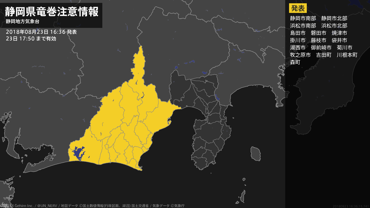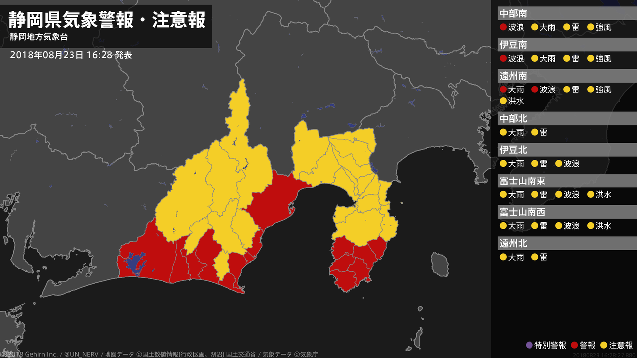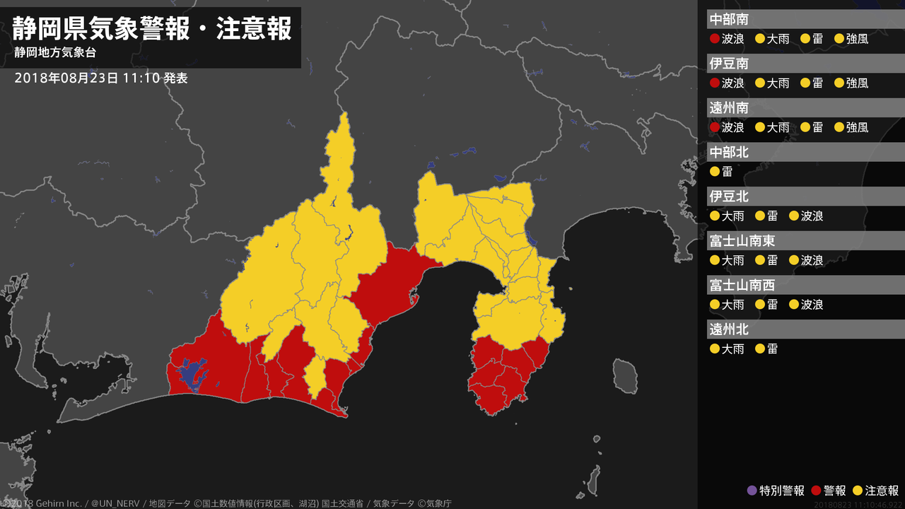 【静岡県 気象警報・注意報 2018年08月23日 16:28】西部では、24日明け方まで低い土地の浸水に警戒してください。中部、伊豆、西部では、24日明け方まで高波に警戒してください。#気象警報注意報 #静岡県