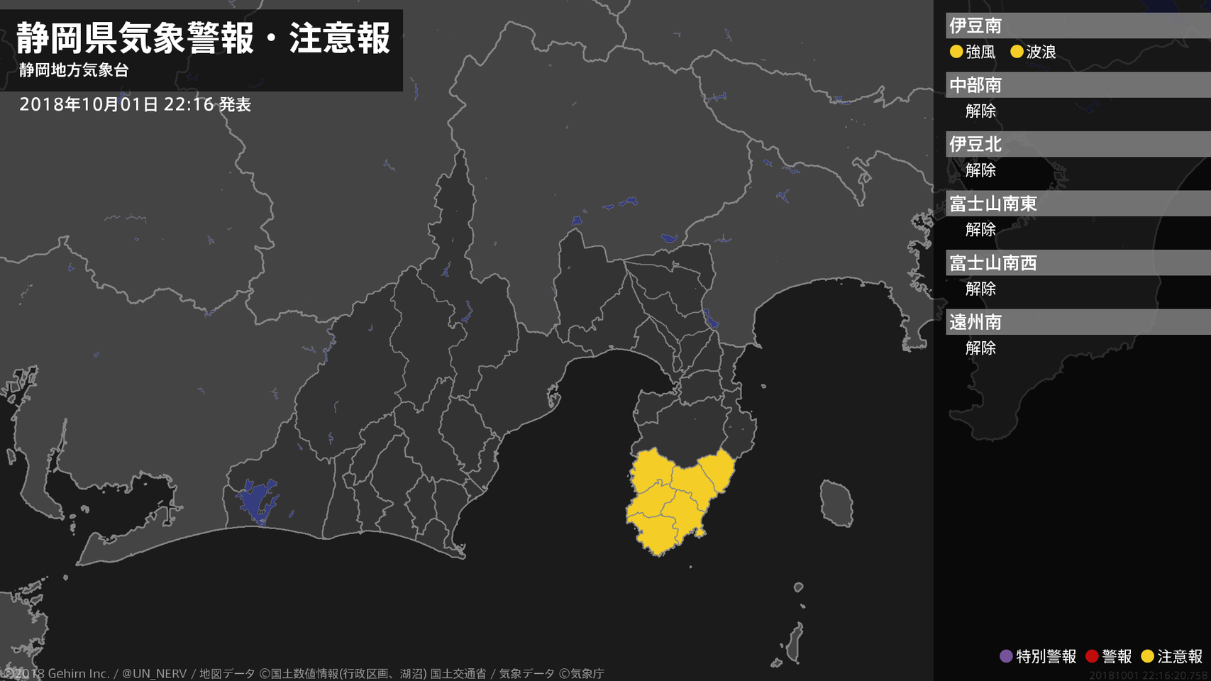 【静岡県 気象警報・注意報 2018年10月01日 22:16】