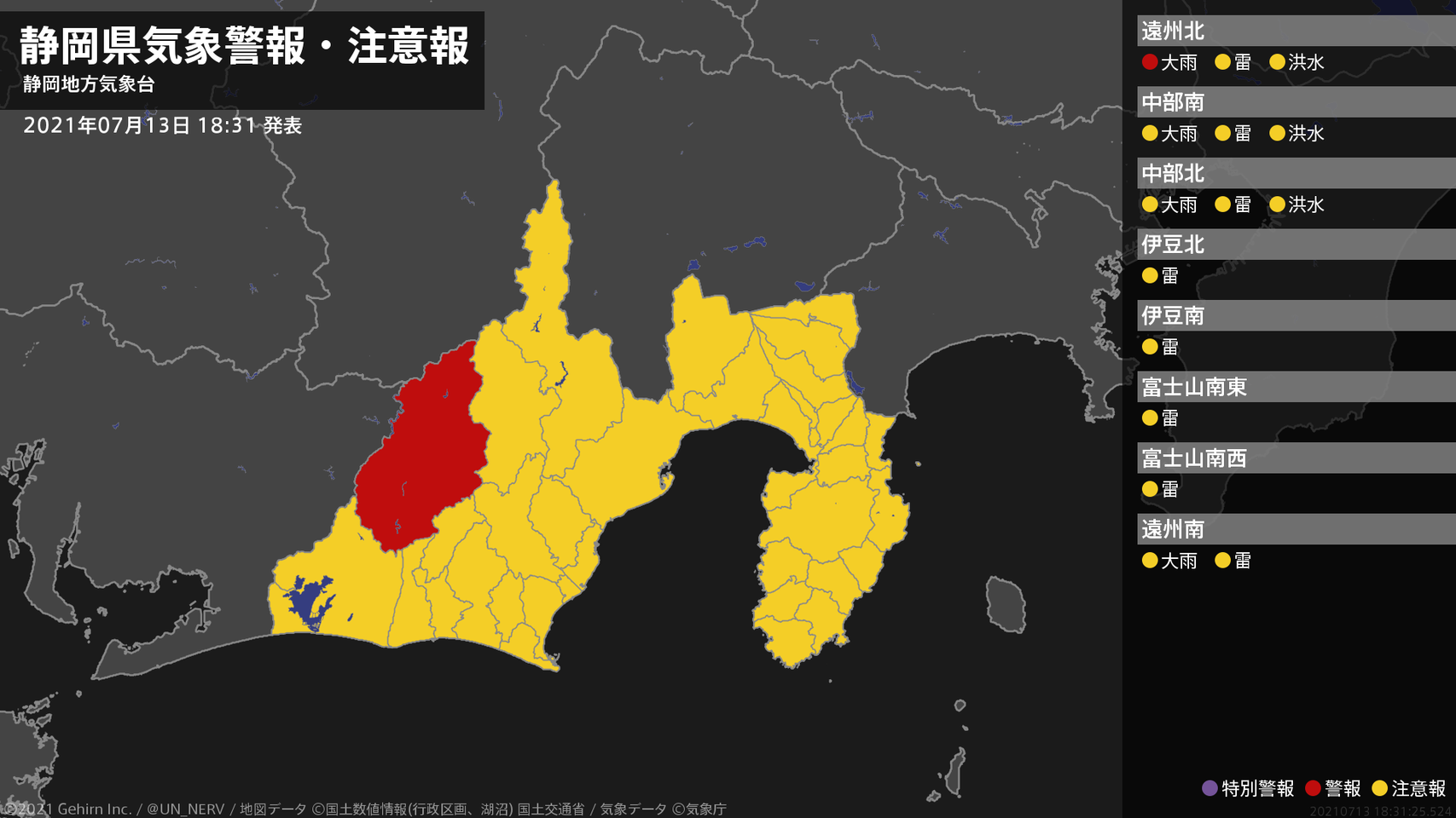 【静岡県 気象警報・注意報 2021年07月13日 18:23】