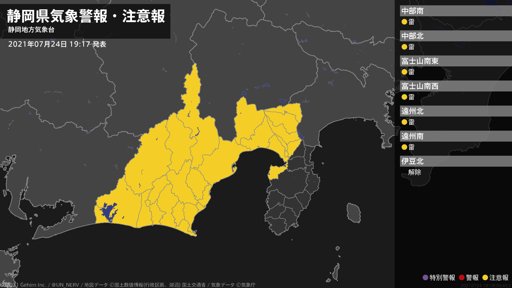 【静岡県 気象警報・注意報 2021年07月23日 19:07】