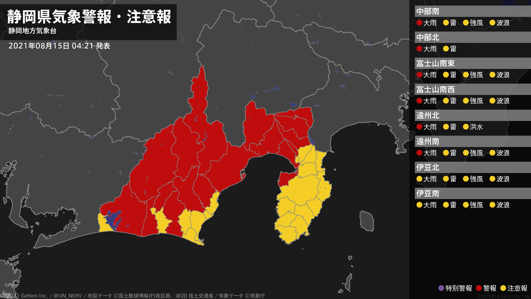 【静岡県 気象警報・注意報 2021年08月15日 04:21】中部、東部、西部では、15日昼過ぎまで土砂災害に警戒してください。#気象警報注意報 #静岡県
