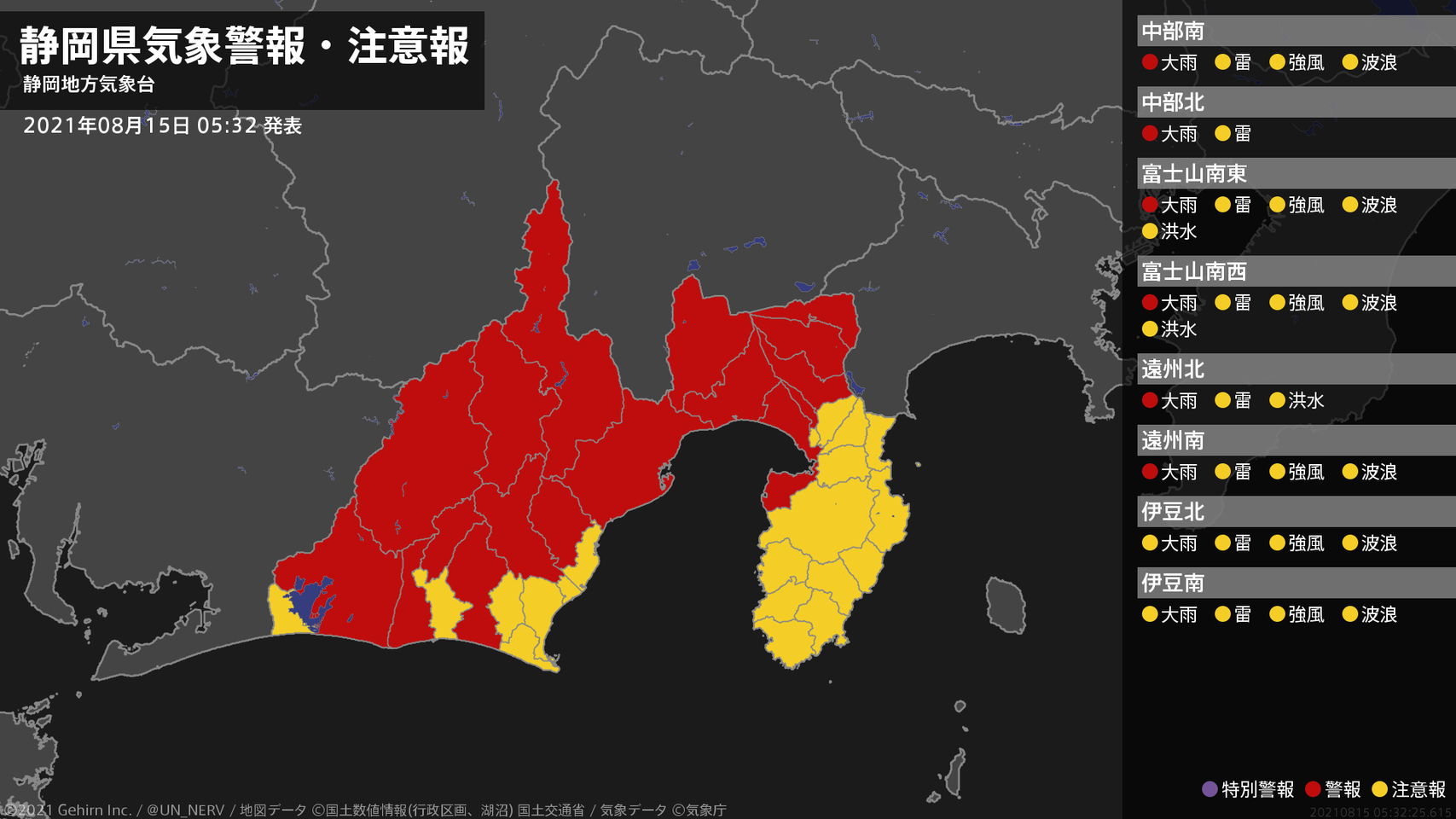 【静岡県 気象警報・注意報 2021年08月15日 05:32】中部、東部、西部では、15日昼過ぎまで土砂災害に警戒してください。#気象警報注意報 #静岡県