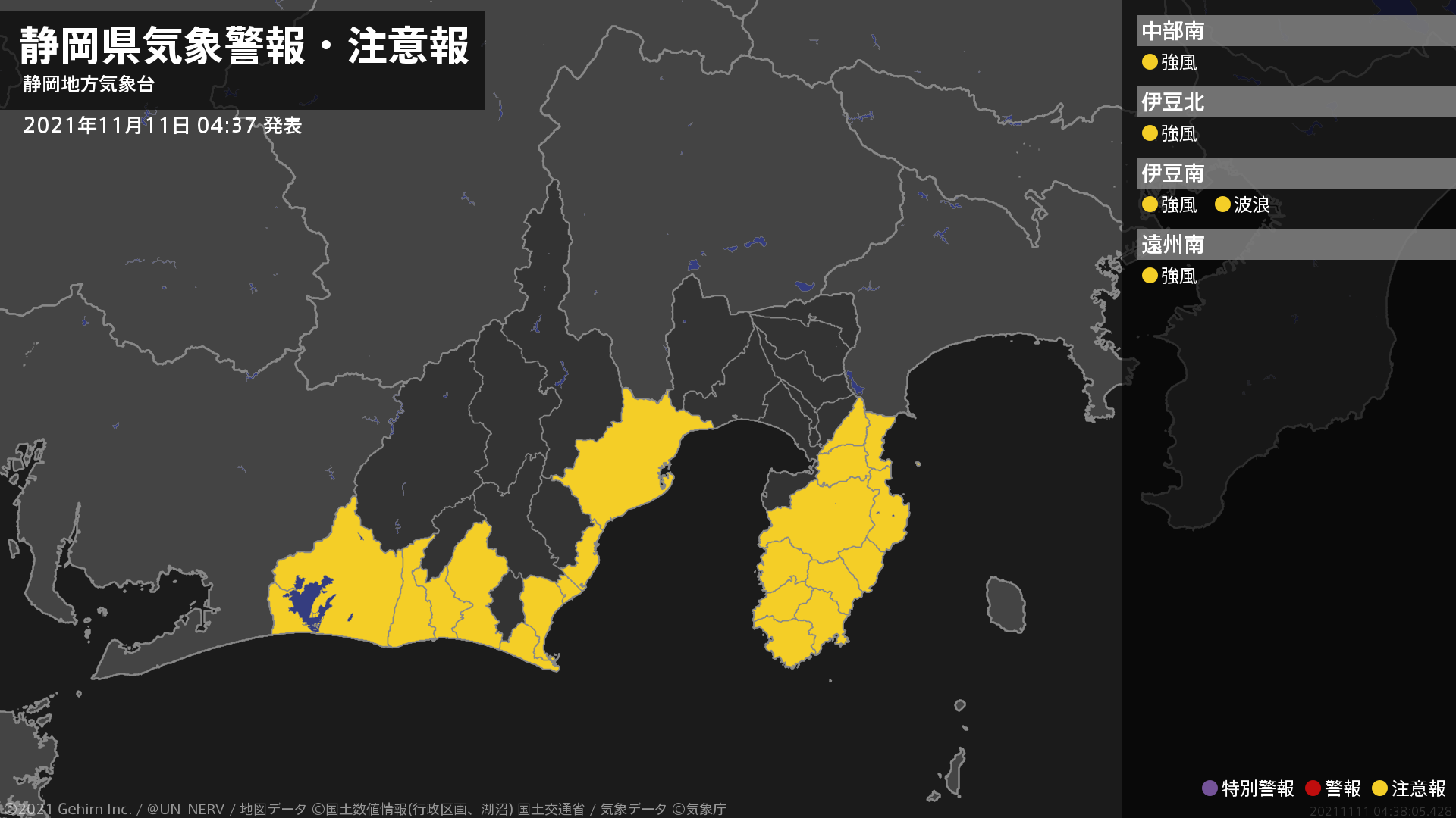 【静岡県 気象警報・注意報 2021年11月11日 04:38】