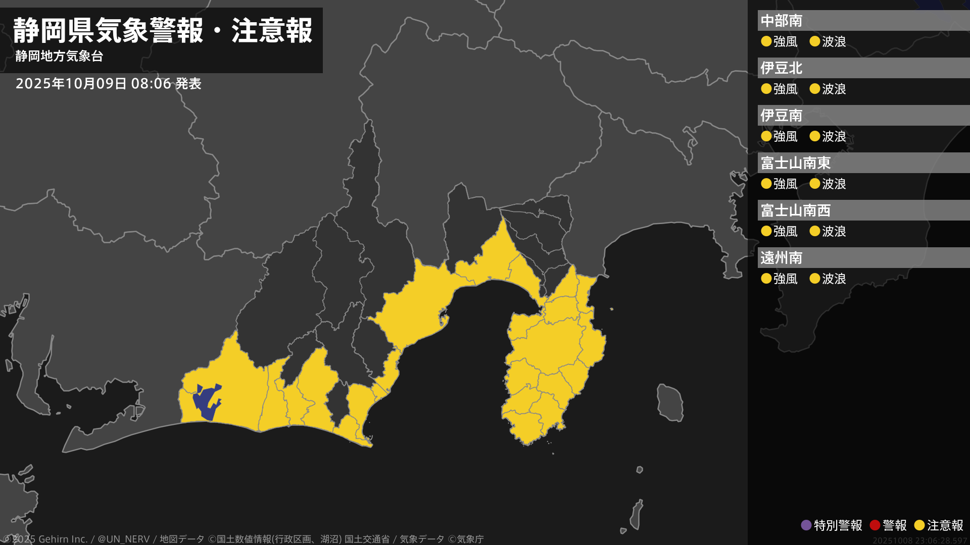 【静岡県 気象警報・注意報 2025年10月09日 10:12】伊豆では、強風に注意してください。中部、伊豆、西部では、高波に注意してください。中部、西部では、高潮に注意してください。#気象警報注意報 #静岡県