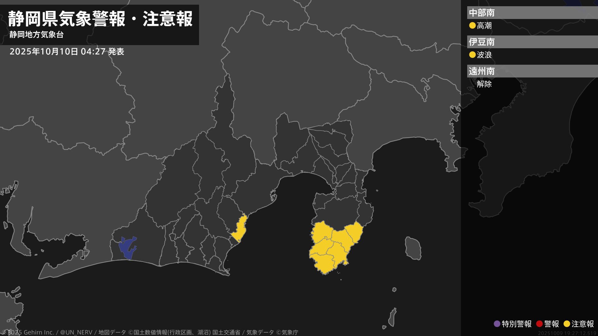 【静岡県 気象警報・注意報 2025年10月10日 10:21】注意報を解除します。#気象警報注意報 #静岡県