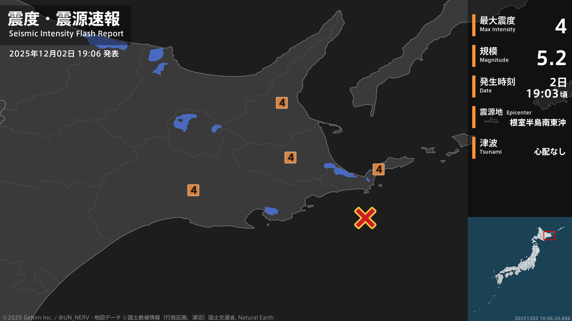 19時3分頃、根室半島南東沖を震源とする地震がありました。震源の深さは約40km、地震の規模はM5.2、最大震度4を北海道で観測しています。この地震による津波の心配はありません。