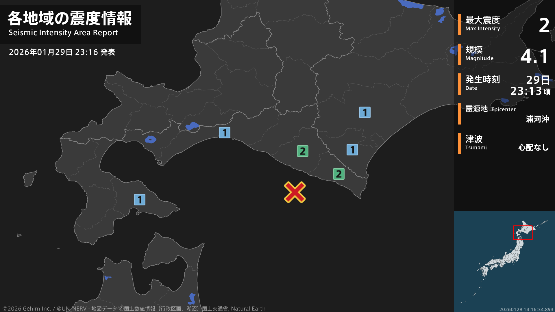 23時13分頃、浦河沖を震源とする地震がありました。震源の深さは約60km、地震の規模はM4.1、最大震度2を北海道で観測しています。この地震による津波の心配はありません。