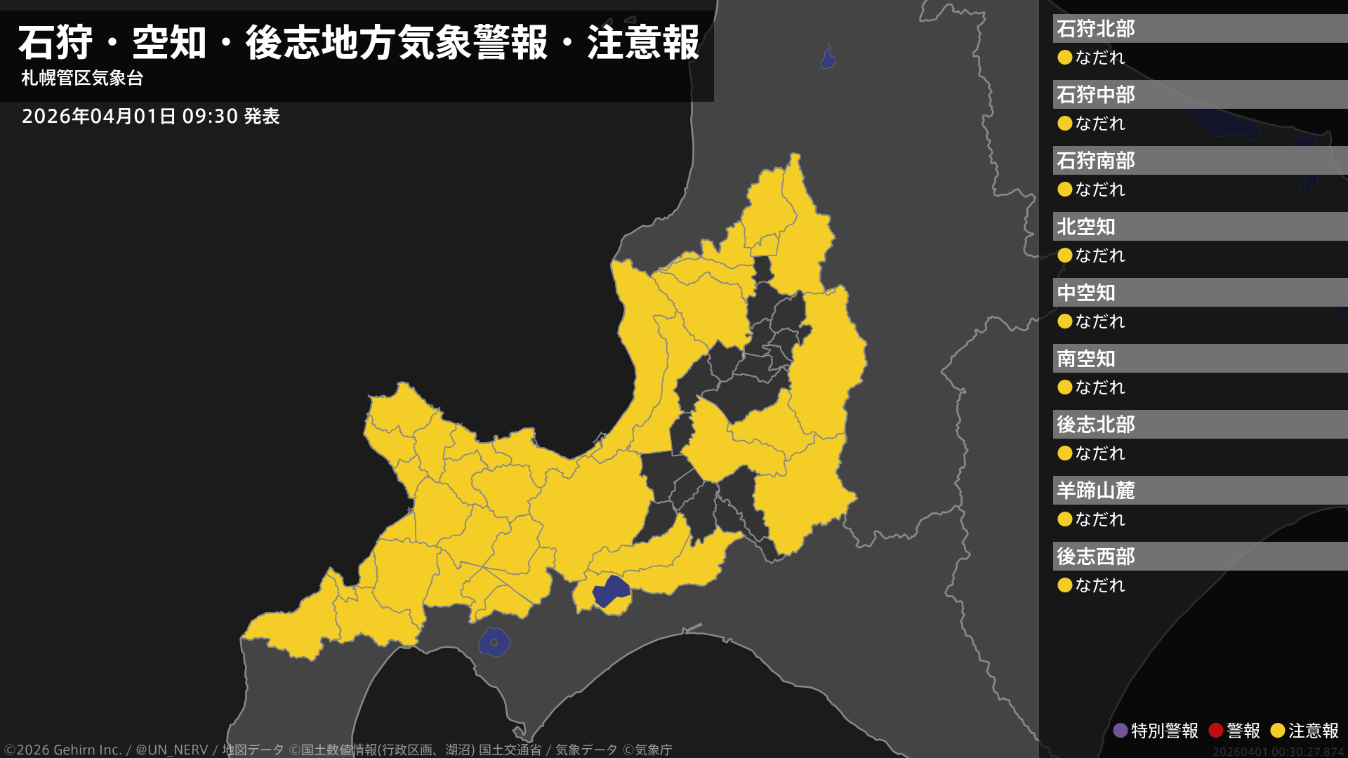 【石狩・空知・後志地方 気象警報・注意報 2026年04月01日 09:30】石狩、空知、後志地方では、2日までなだれに注意してください。#気象警報注意報 #石狩地方 #空知地方 #後志地方