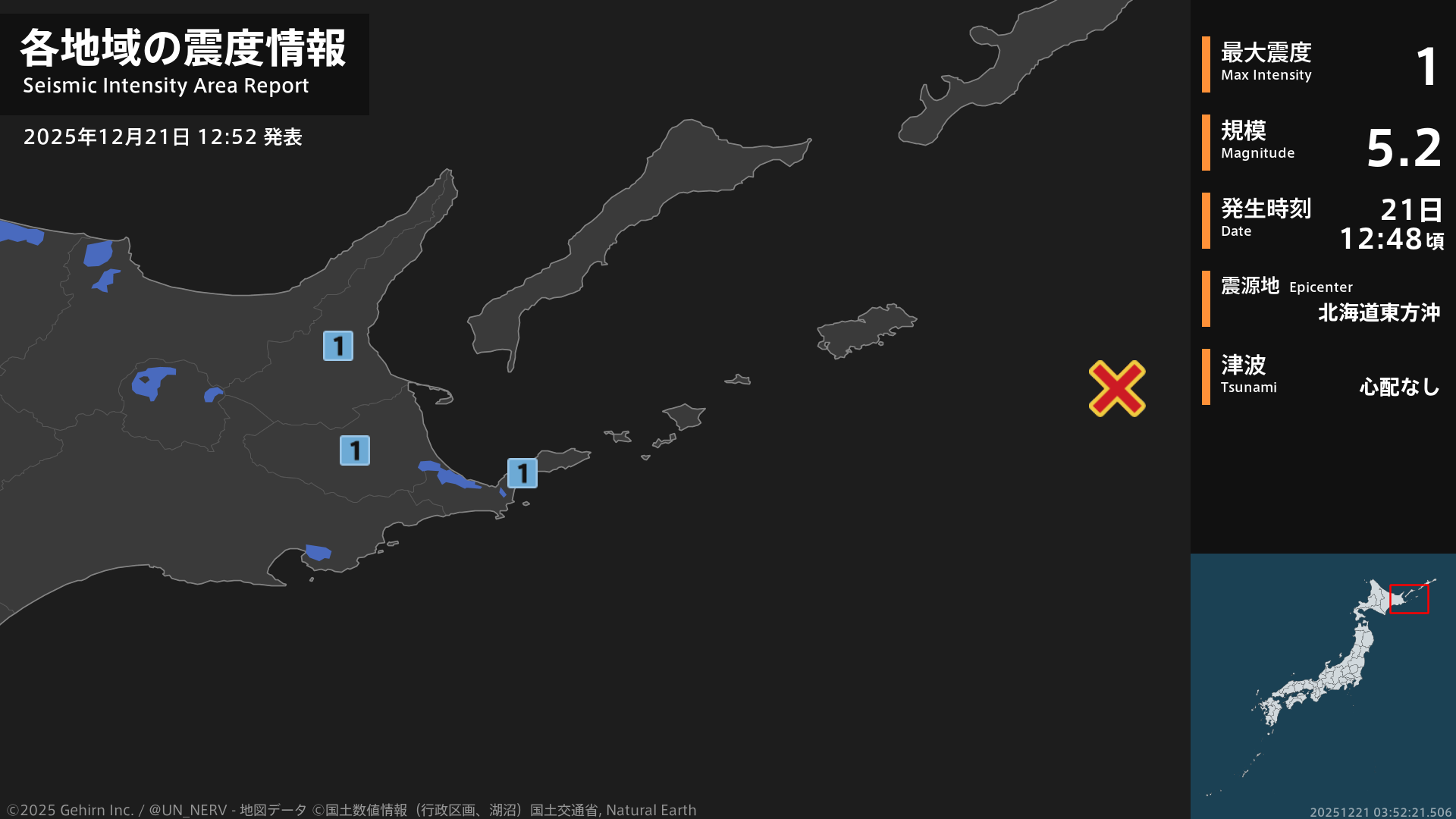 【地震情報 2025年12月21日】12時48分頃、北海道東方沖を震源とする地震がありました。震源の深さはごく浅い、地震の規模はM5.2、最大震度1を北海道で観測しています。この地震による津波の心配はありません。#地震 #北海道