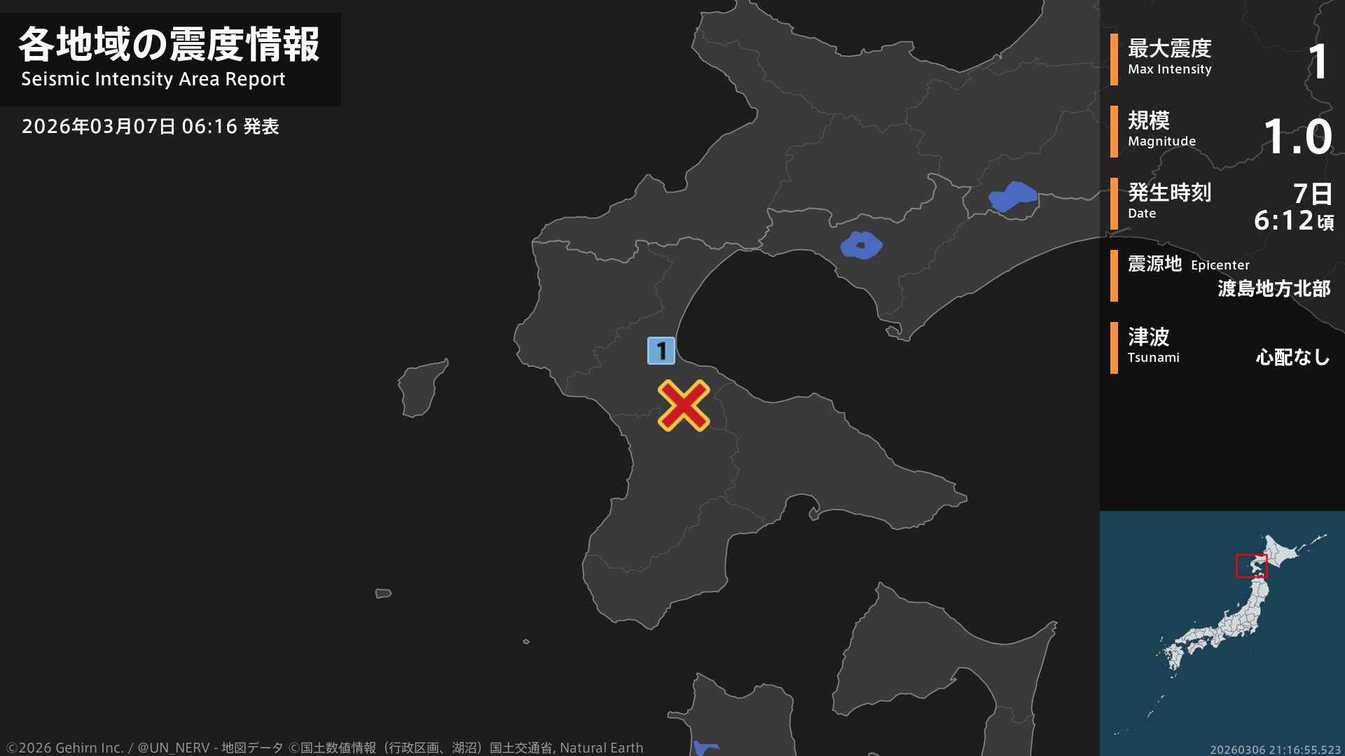 6時12分頃、渡島地方北部を震源とする地震がありました。震源の深さはごく浅い、地震の規模はM1.0、最大震度1を北海道で観測しています。この地震による津波の心配はありません。