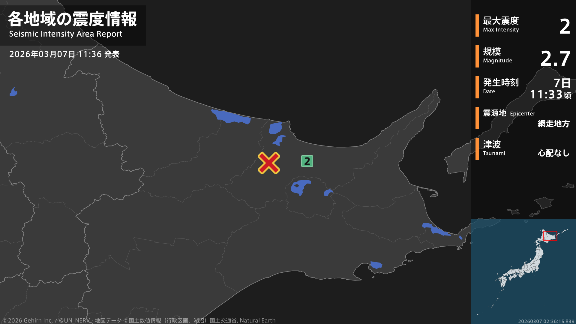 11時33分頃、網走地方を震源とする地震がありました。震源の深さはごく浅い、地震の規模はM2.7、最大震度2を北海道で観測しています。この地震による津波の心配はありません。