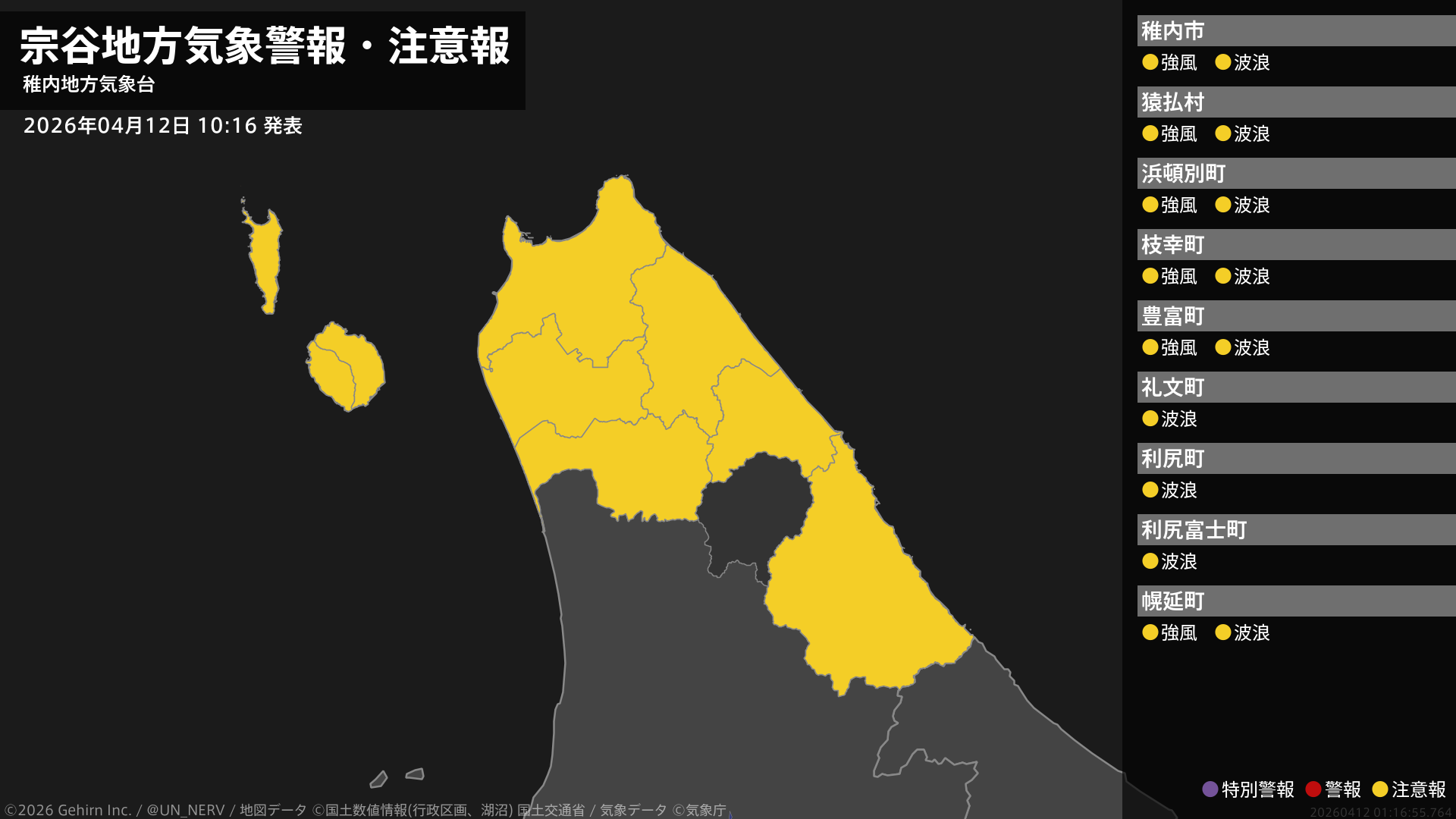 【宗谷地方 気象警報・注意報 2026年04月12日 10:16】宗谷地方では、12日夕方まで強風や高波に注意してください。#気象警報注意報 #宗谷地方