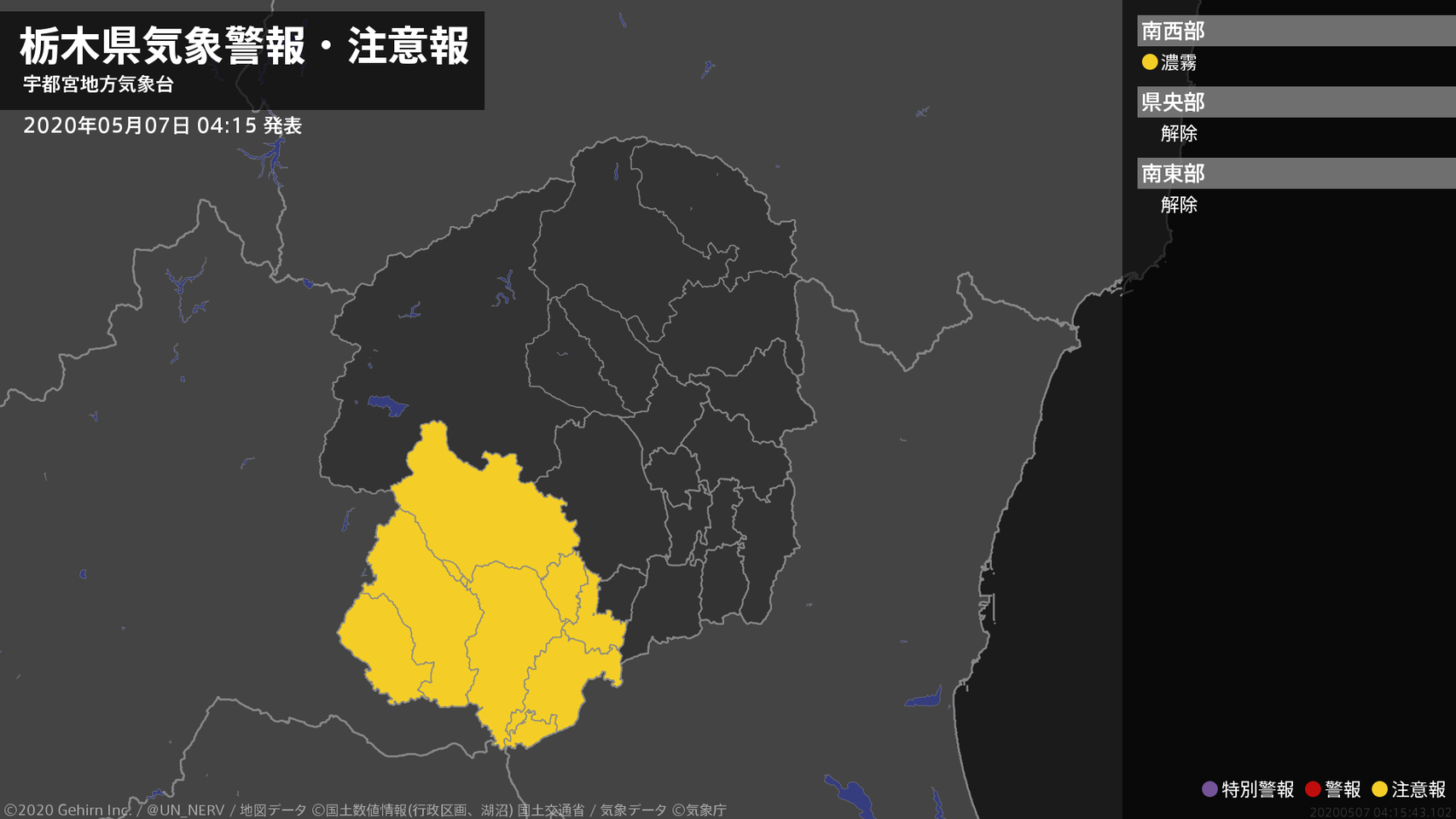 【栃木県 気象警報・注意報 2020年05月07日 01:11】南部では、7日昼前まで濃霧による視程障害に注意してください。#気象警報注意報 #栃木県