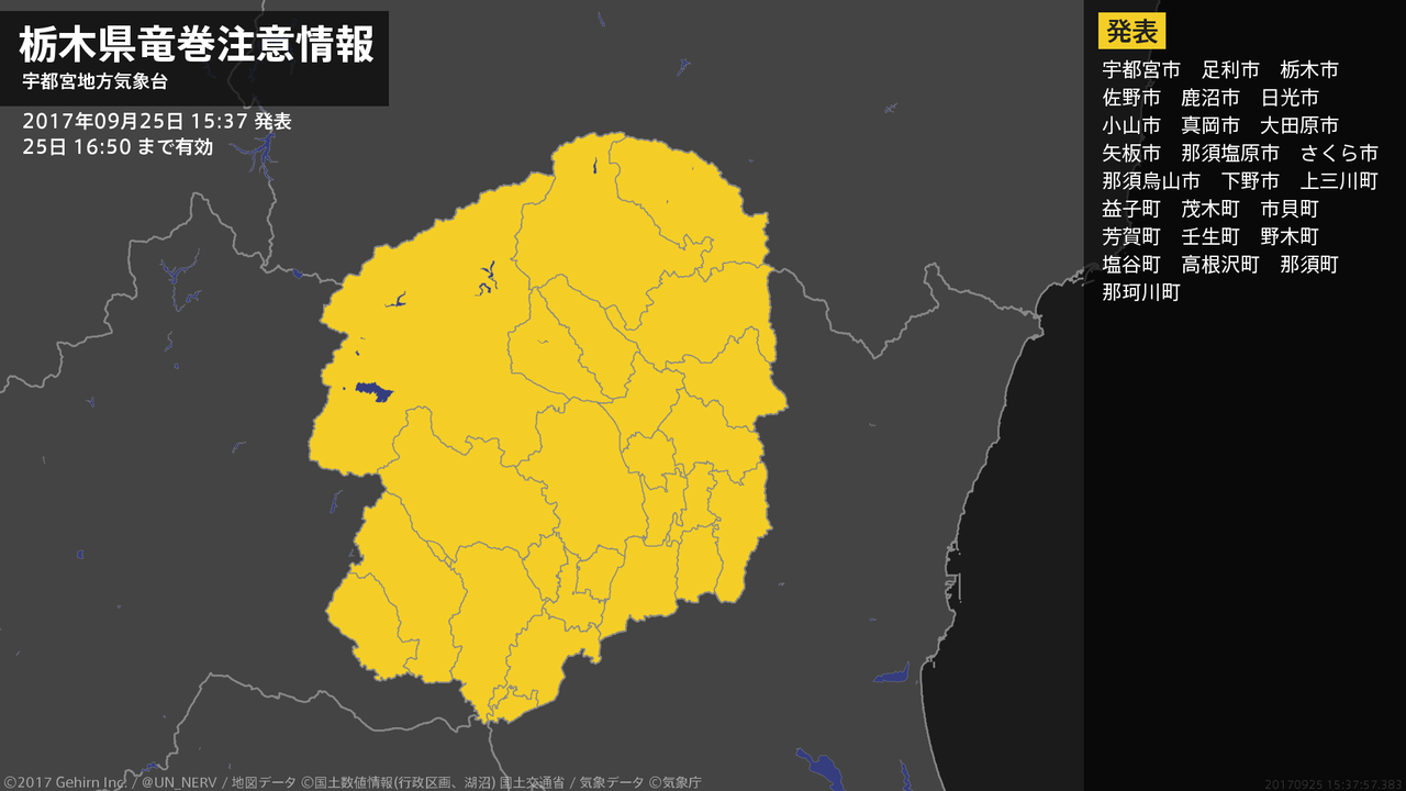 栃木県は、竜巻などの激しい突風が発生しやすい気象状況になっています。頑丈な建物内に移動するなど安全確保に努めてください。この情報は25日16:50まで有効です。