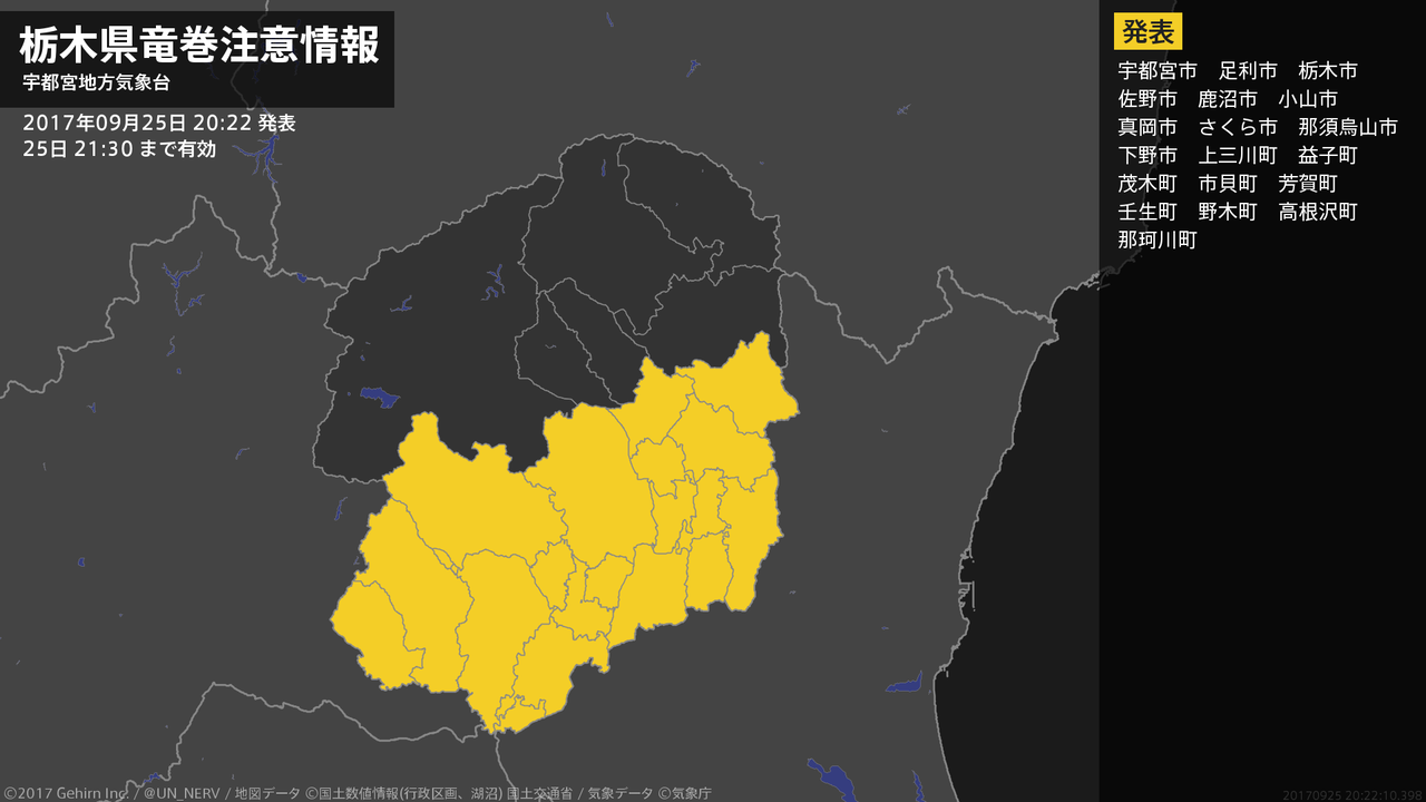 栃木県は、竜巻などの激しい突風が発生しやすい気象状況になっています。頑丈な建物内に移動するなど安全確保に努めてください。この情報は25日20:20まで有効です。