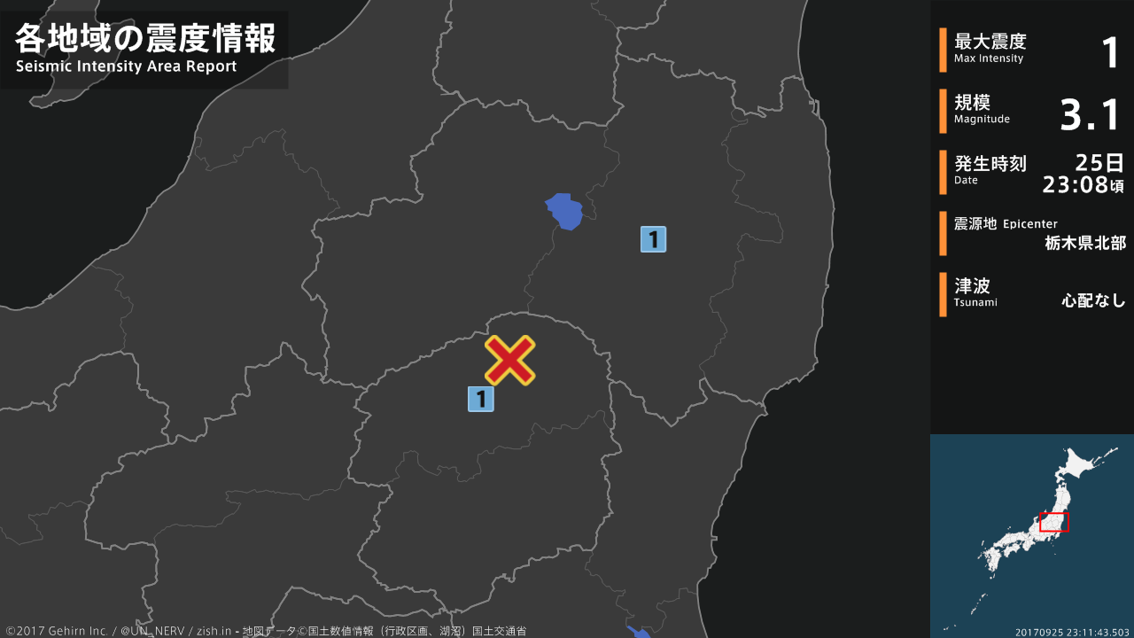 23時08分頃、栃木県北部を震源とする地震がありました。震源の深さは約10km、地震の規模はM3.1、最大震度1を福島県、栃木県で観測しています。この地震による津波の心配はありません。