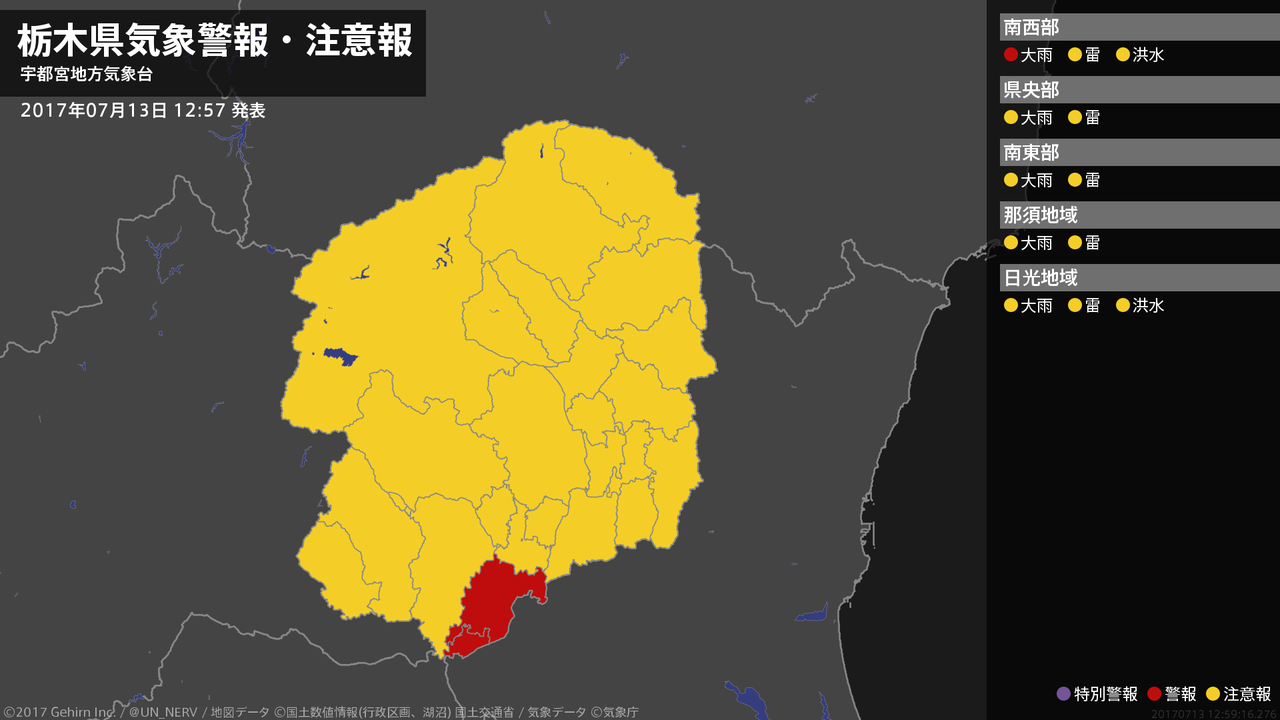 【栃木県 気象警報 2017年07月13日 12:59】