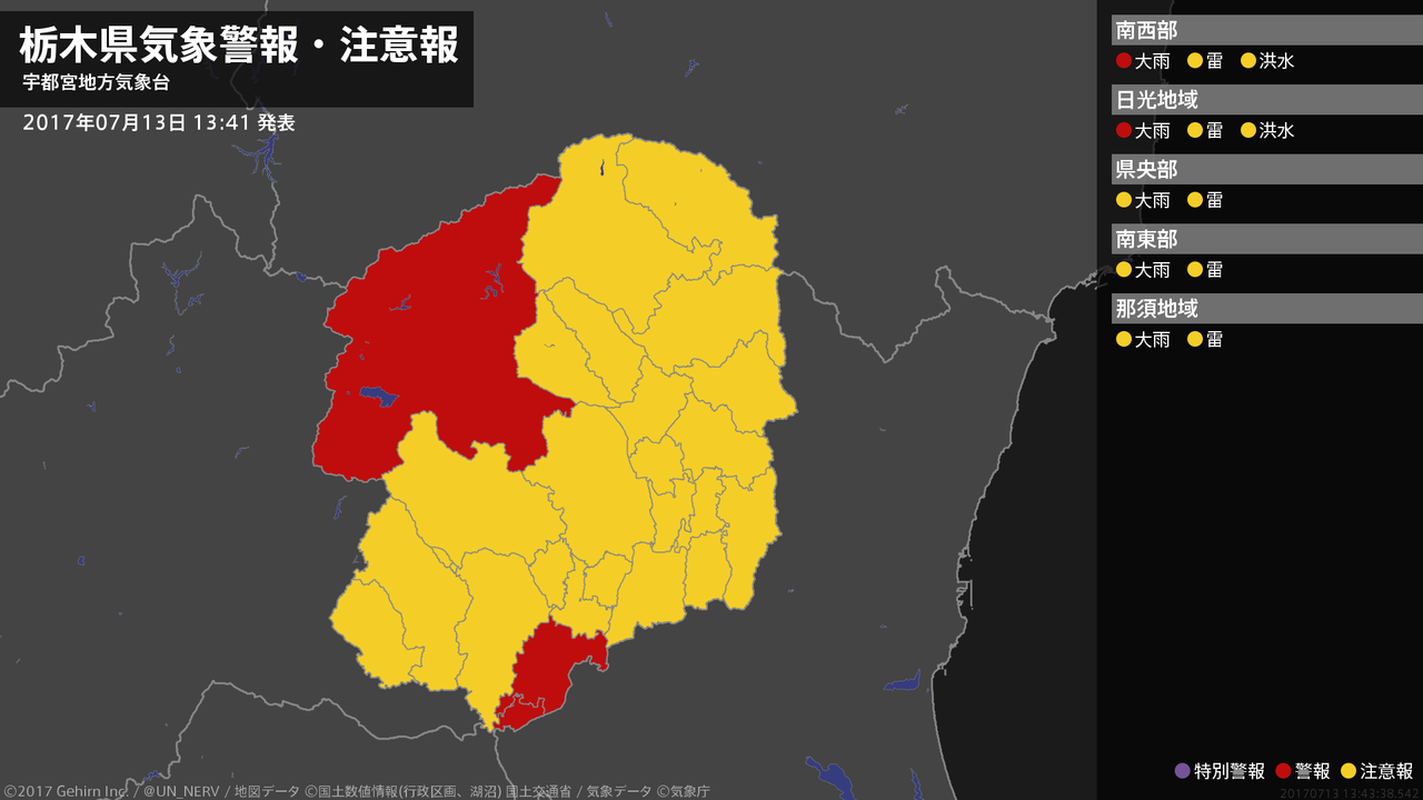 【栃木県 気象警報 2017年07月13日 13:43】