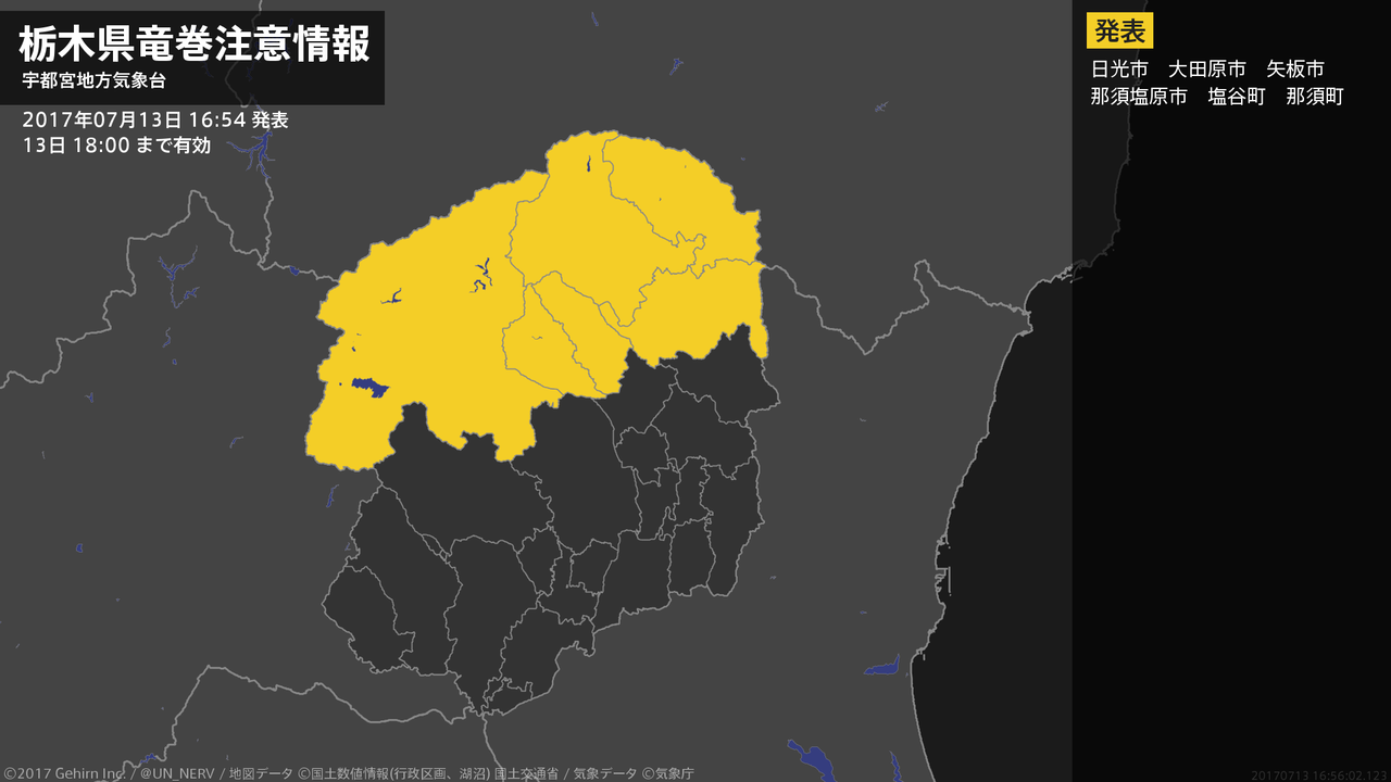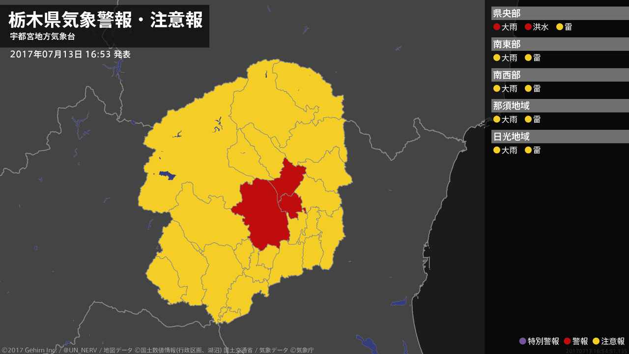 【栃木県 気象警報 2017年07月13日 16:54】