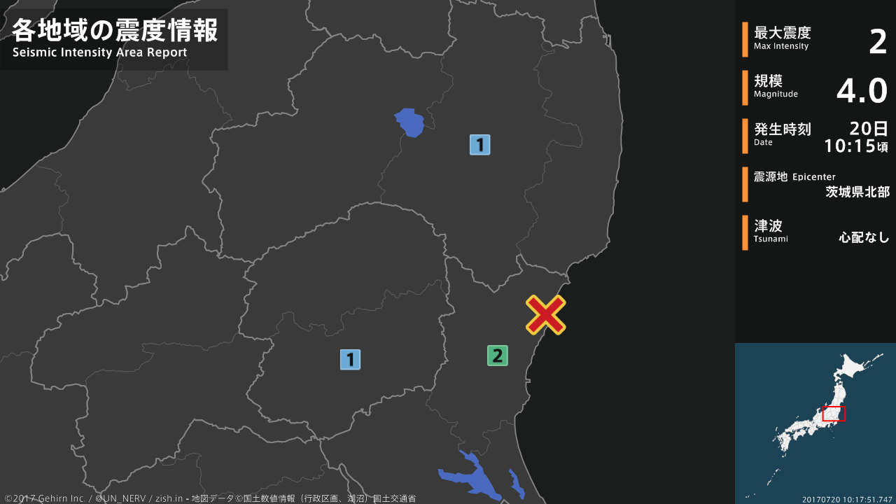 【地震情報 2017年7月20日】10時15分頃、茨城県北部を震源とする地震がありました。震源の深さは約10km、地震の規模はM4.0、最大震度2を茨城県で観測しています。この地震による津波の心配はありません。#地震 #茨城県 #福島県 #栃木県