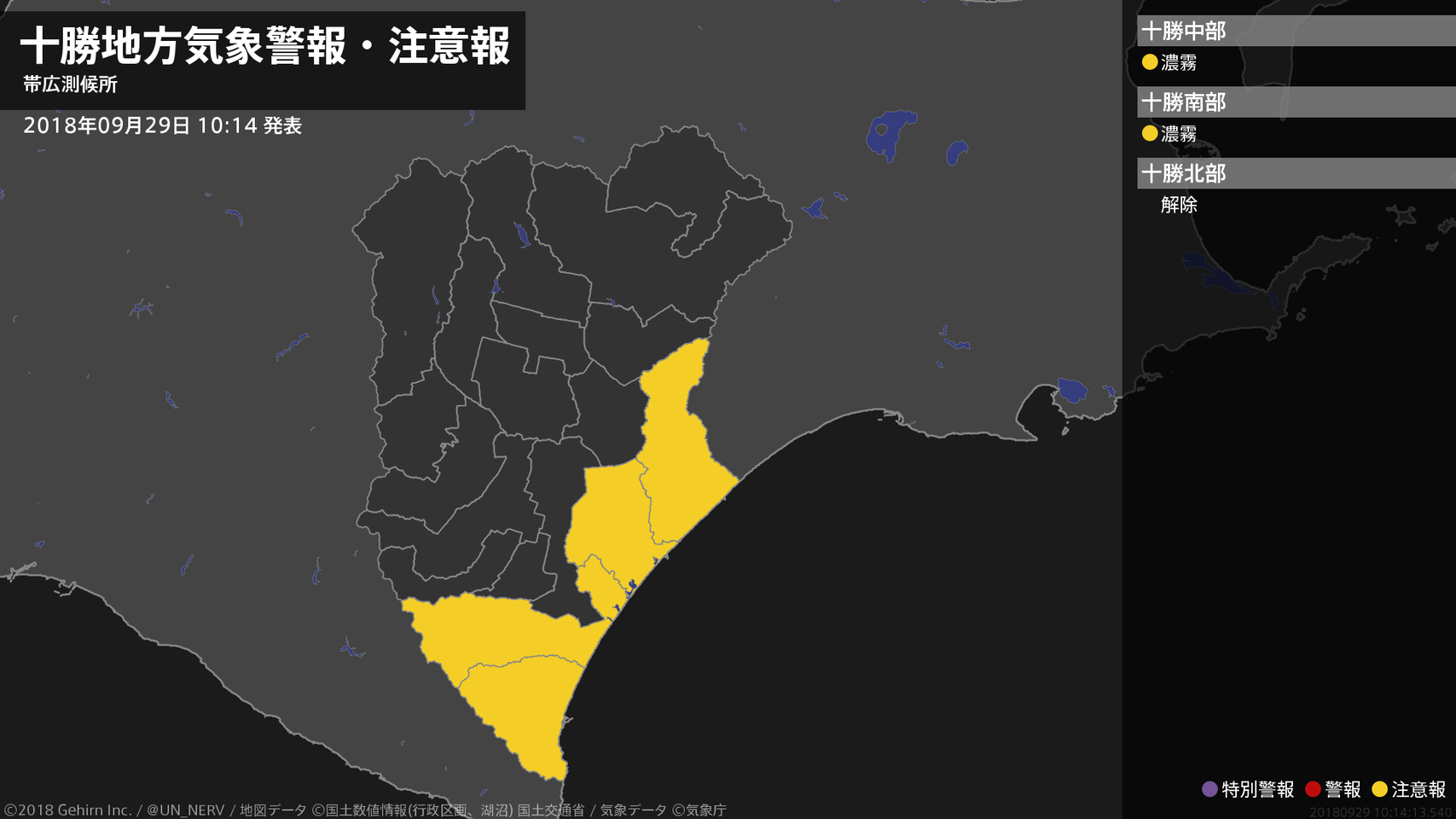 【十勝地方 気象警報・注意報 2018年09月29日 10:14】