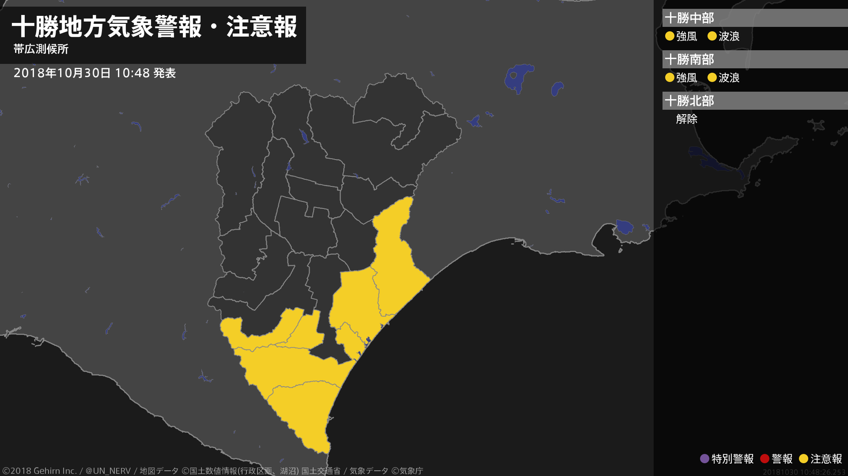 【十勝地方 気象警報・注意報 2018年10月30日 03:56】十勝地方では、強風や高波、急な強い雨、落雷に注意してください。#気象警報注意報 #十勝地方