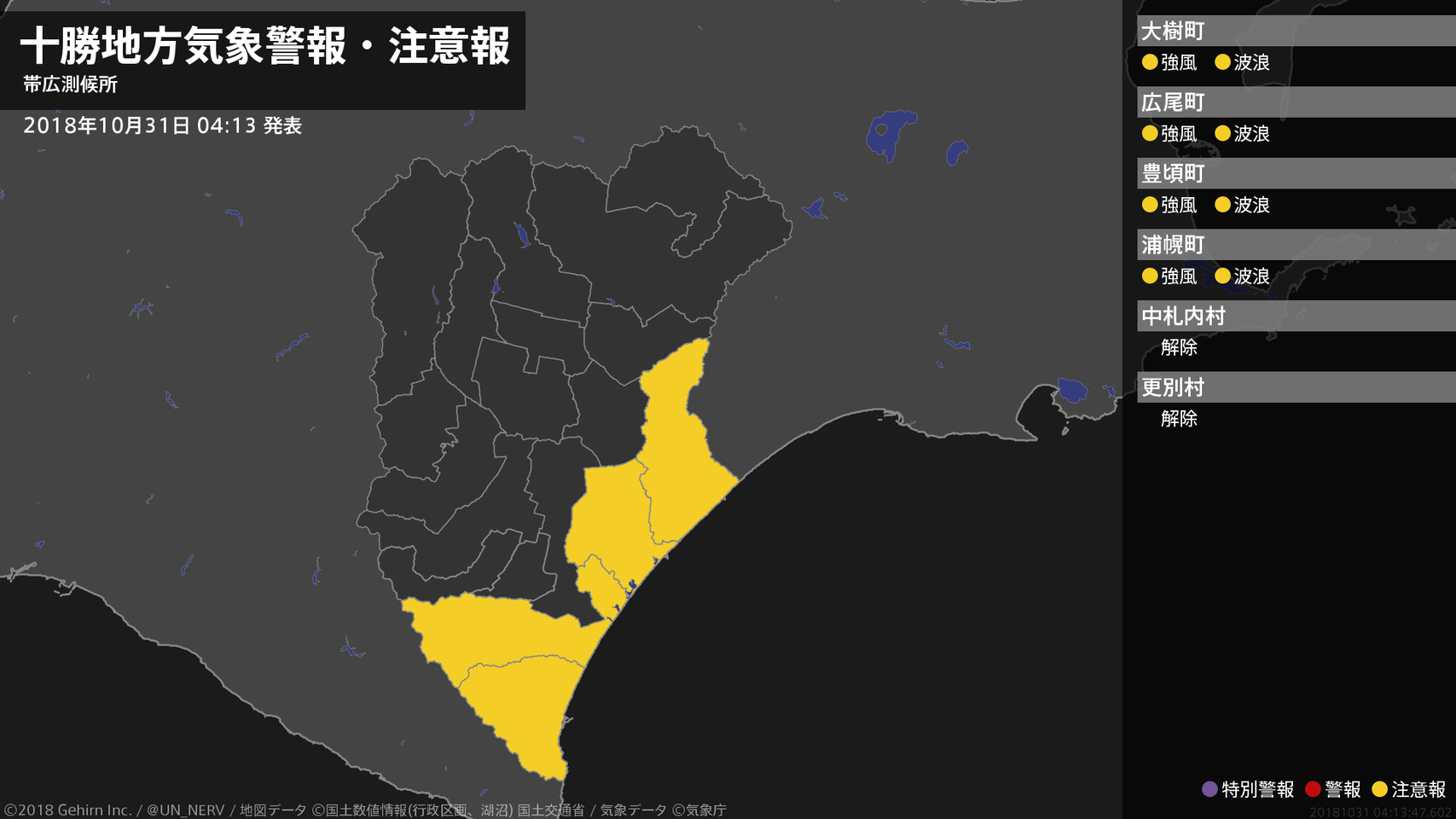 【十勝地方 気象警報・注意報 2018年10月31日 04:13】十勝地方では、31日昼過ぎまで強風や高波に注意してください。#気象警報注意報 #十勝地方