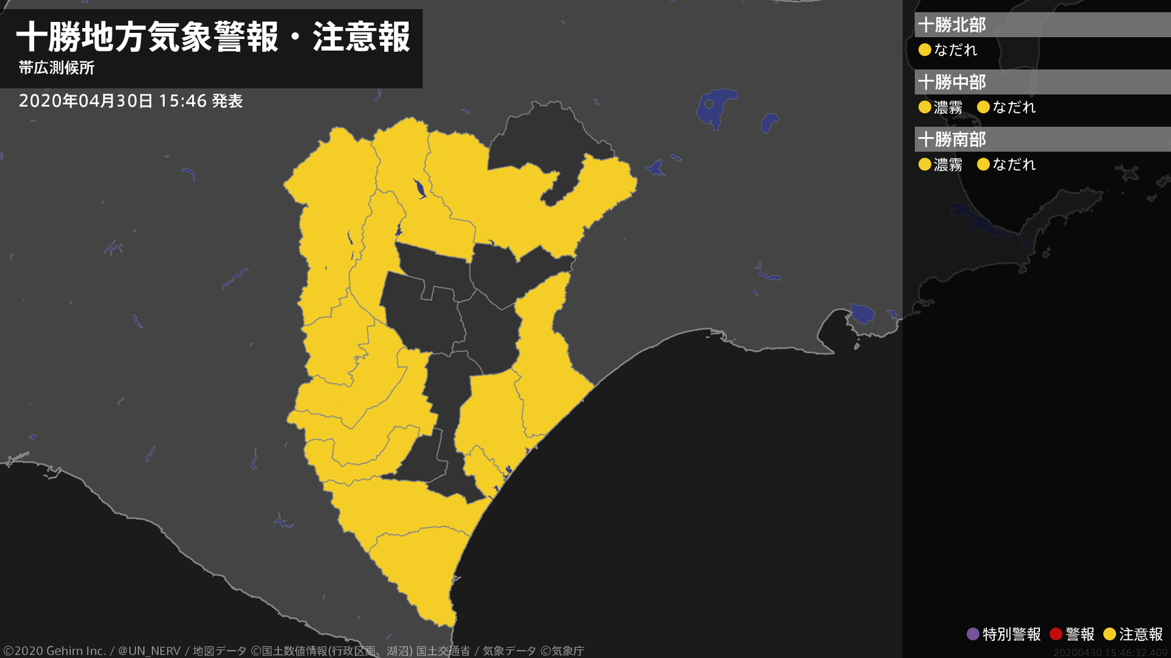 【十勝地方 気象警報・注意報 2020年04月30日 15:46】十勝地方では、1日未明から濃霧による視程障害に、ここしばらくなだれに注意してください。#気象警報注意報 #十勝地方