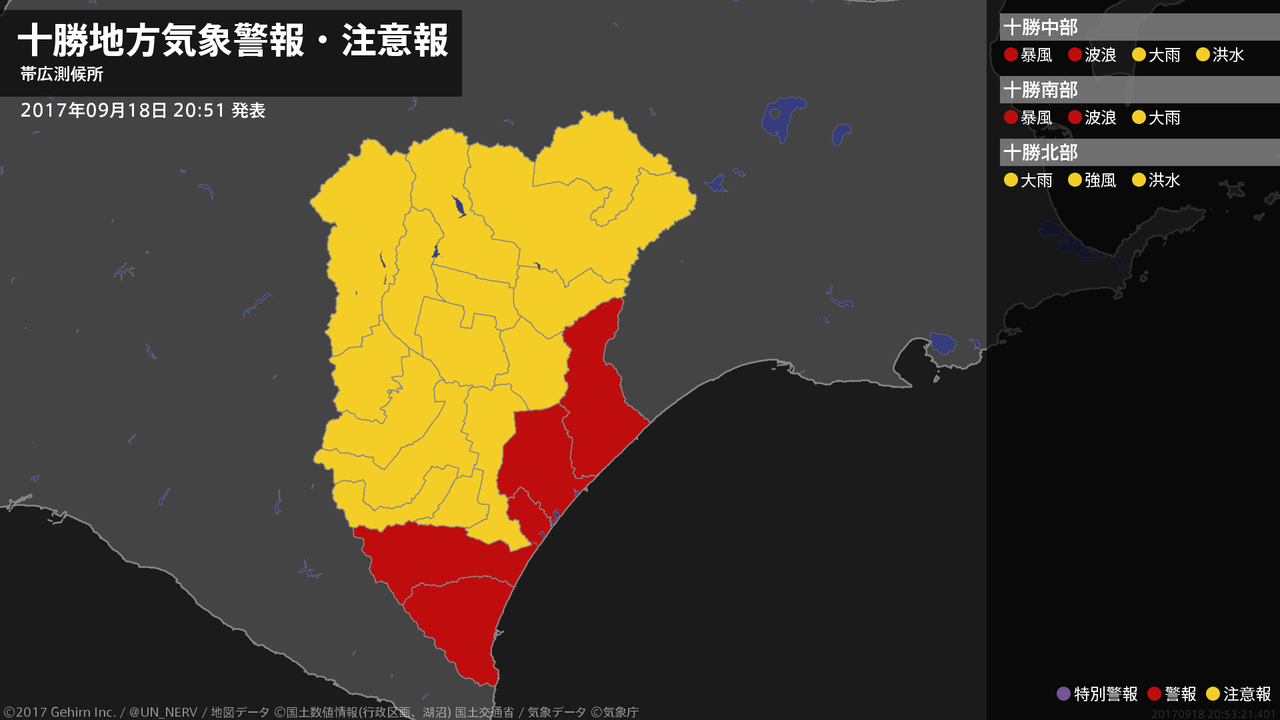 【十勝地方 気象警報・注意報 2017年09月18日 20:53】