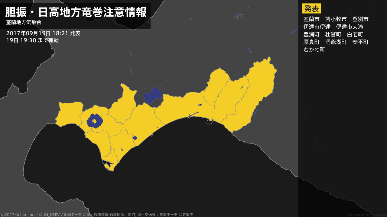 十勝地方は、竜巻などの激しい突風が発生しやすい気象状況になっています。頑丈な建物内に移動するなど安全確保に努めてください。この情報は19日19:30まで有効です。