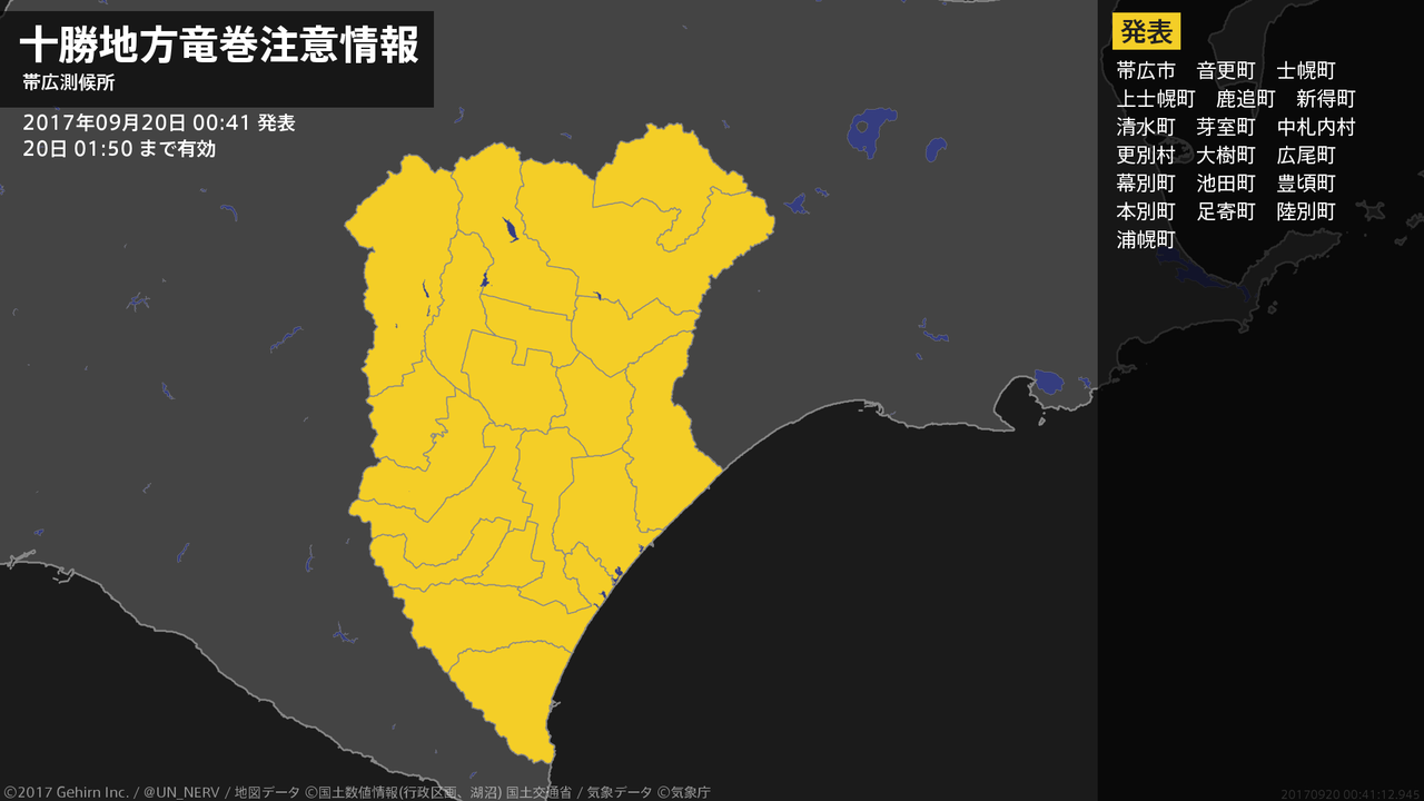 十勝地方は、竜巻などの激しい突風が発生しやすい気象状況になっています。頑丈な建物内に移動するなど安全確保に努めてください。この情報は20日01:50まで有効です。