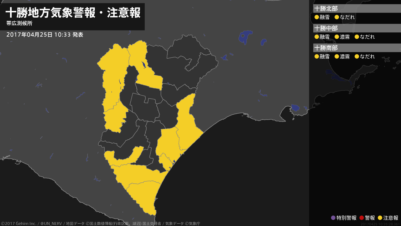 【十勝地方 気象警報・注意報 2017年04月25日 10:35】十勝地方では、融雪や濃霧による視程障害、なだれに注意してください。#気象警報注意報 #十勝地方