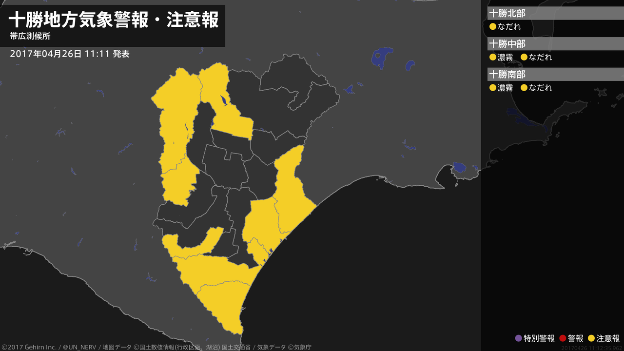 【十勝地方 気象警報・注意報 2017年04月26日 11:12】十勝地方では、27日昼前まで濃霧による視程障害に、26日までなだれに注意してください。#気象警報注意報 #十勝地方