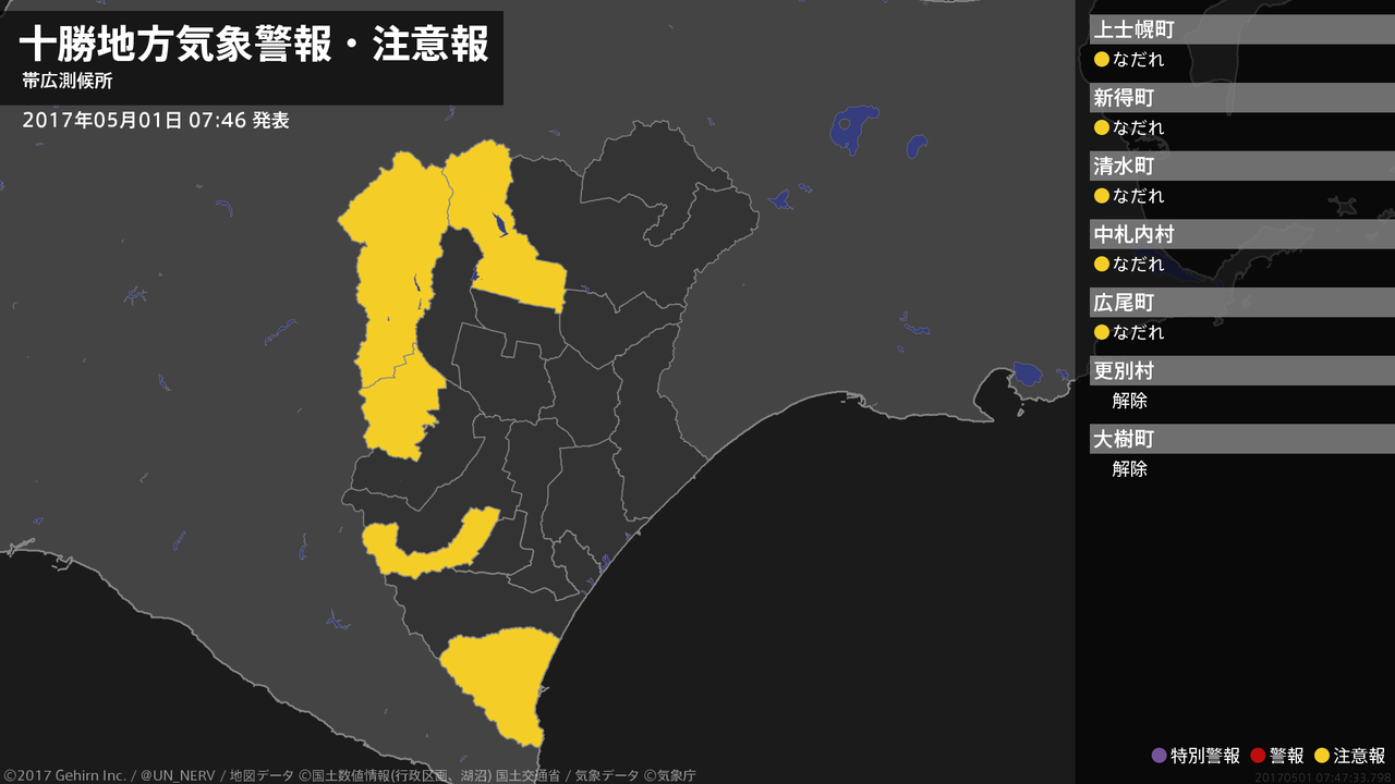 【十勝地方 気象警報・注意報 2017年05月03日 01:07】十勝地方では、3日昼前から融雪に、3日昼前まで濃霧による視程障害に、ここしばらくなだれに注意してください。#気象警報注意報 #十勝地方