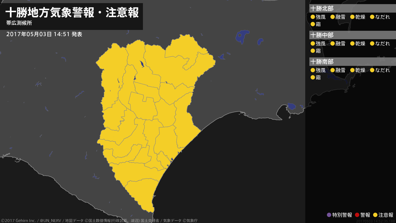 【十勝地方 気象警報・注意報 2017年05月03日 14:52】十勝地方では、強風や融雪、空気の乾燥による火の取り扱い、なだれ、霜に対する農作物の管理に注意してください。#気象警報注意報 #十勝地方