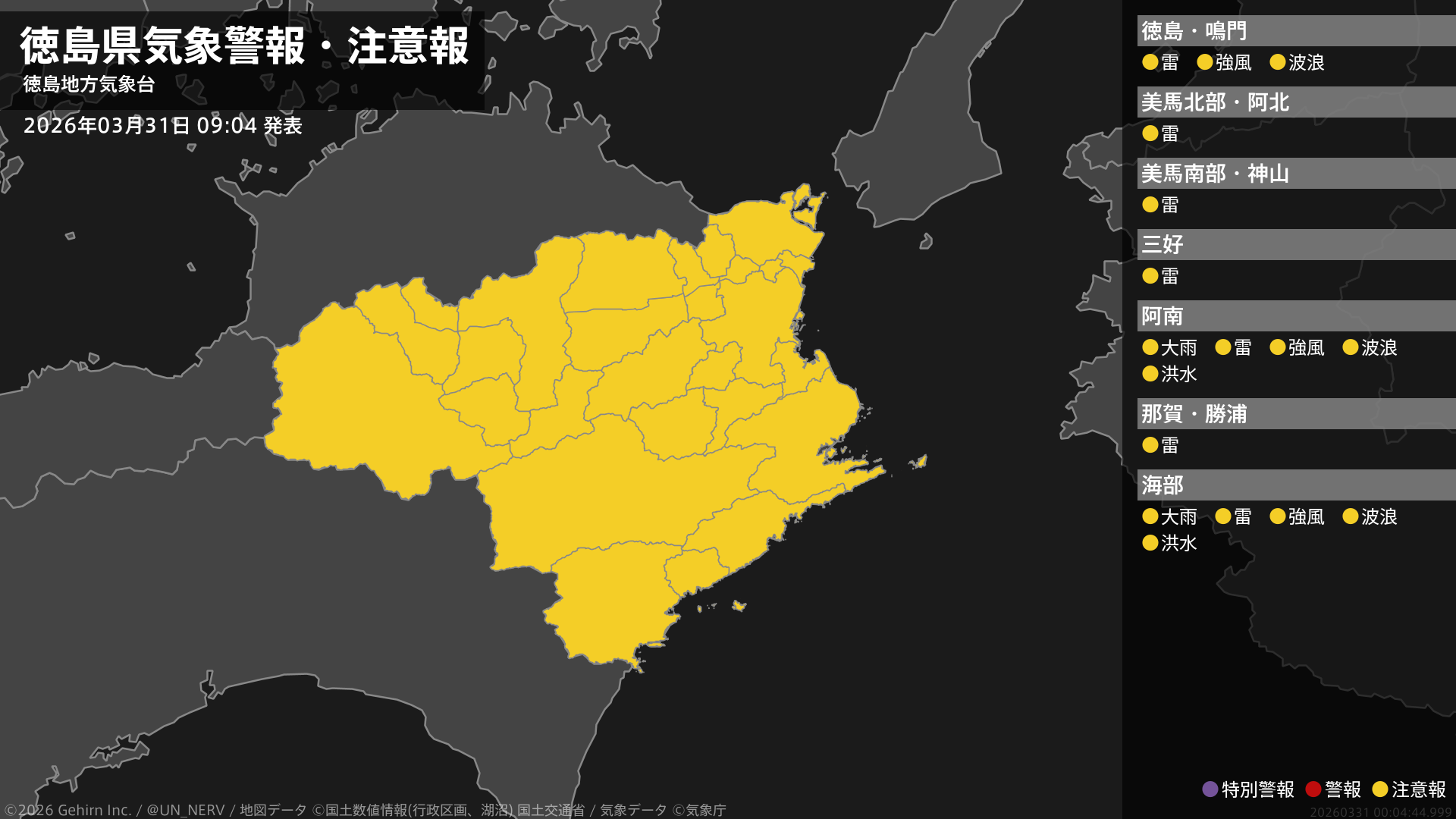 【徳島県 気象警報・注意報 2026年03月31日 09:04】南部では、土砂災害や低い土地の浸水、河川の増水に注意してください。徳島県では、強風や高波、竜巻などの激しい突風、落雷に注意してください。#気象警報注意報 #徳島県