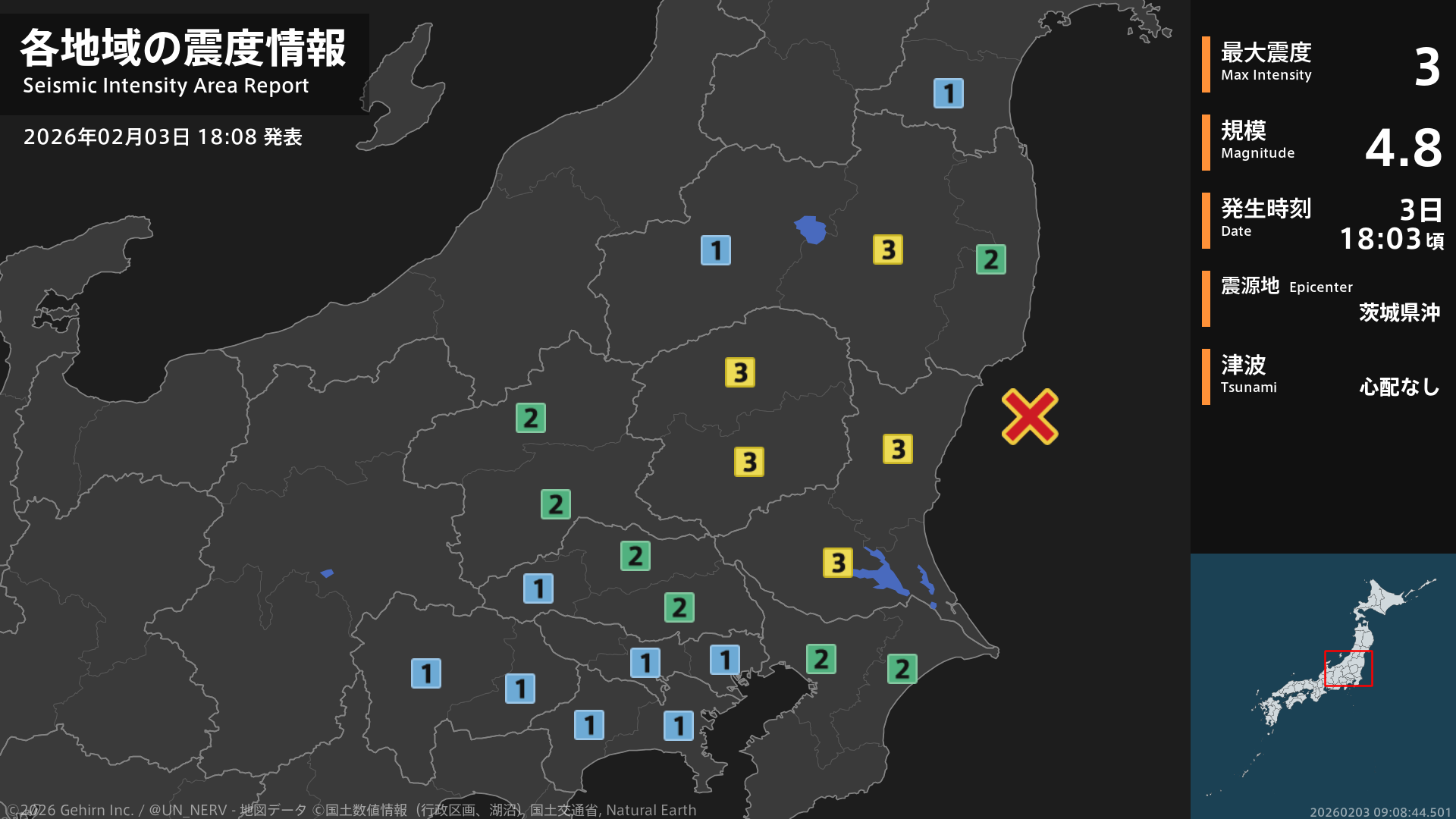 18時3分頃、茨城県沖を震源とする地震がありました。震源の深さは約50km、地震の規模はM4.8、最大震度3を福島県、茨城県、栃木県で観測しています。この地震による津波の心配はありません。