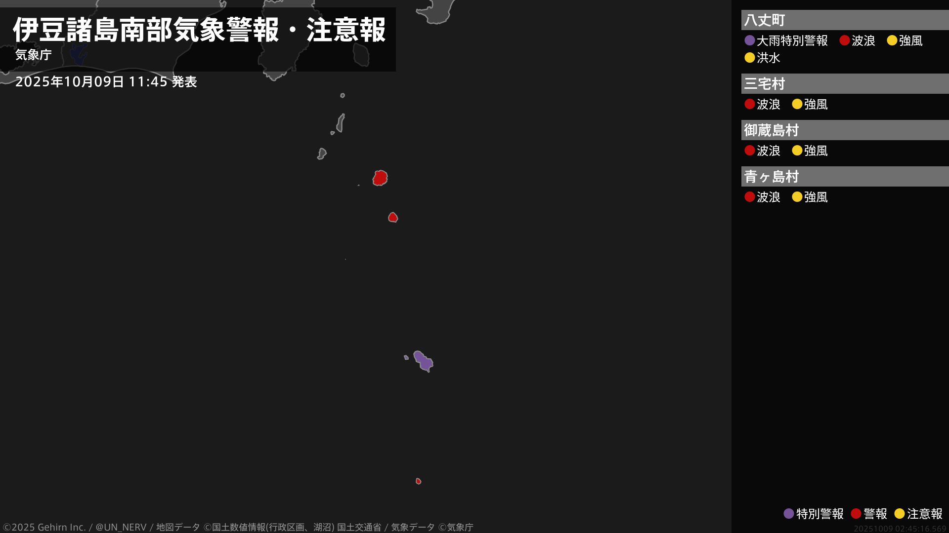 【東京都 気象警報 2025年10月09日 11:45】【特別警報(大雨)】八丈島に特別警報を発表しています。土砂災害に最大級の警戒をしてください。#気象警報 #気象警報注意報 #東京都