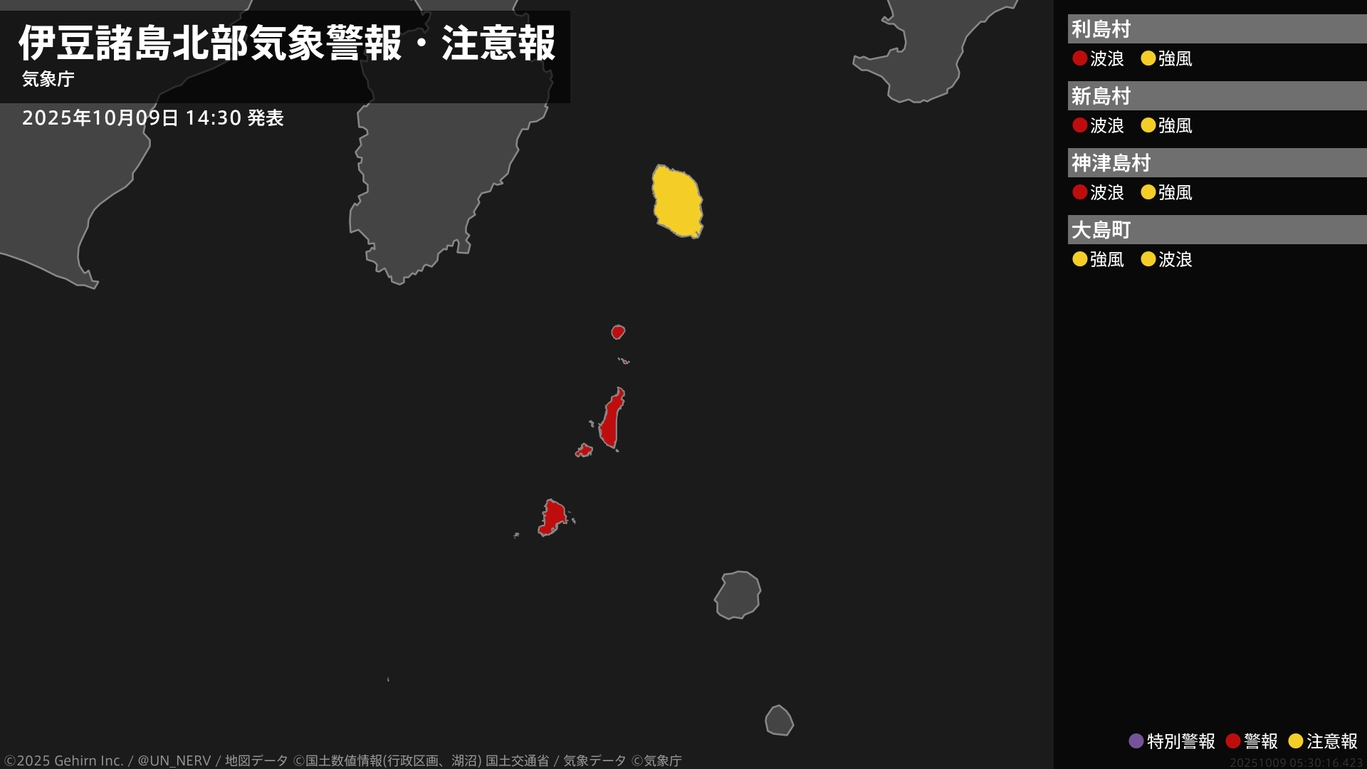 【東京都 気象警報 2025年10月09日 14:30】【警報に切り替え】伊豆諸島南部では、9日夜遅くまで土砂災害に警戒してください。伊豆諸島北部では9日夕方まで、伊豆諸島南部では9日夜遅くまで、高波に警戒してください。#気象警報 #気象警報注意報 #東京都
