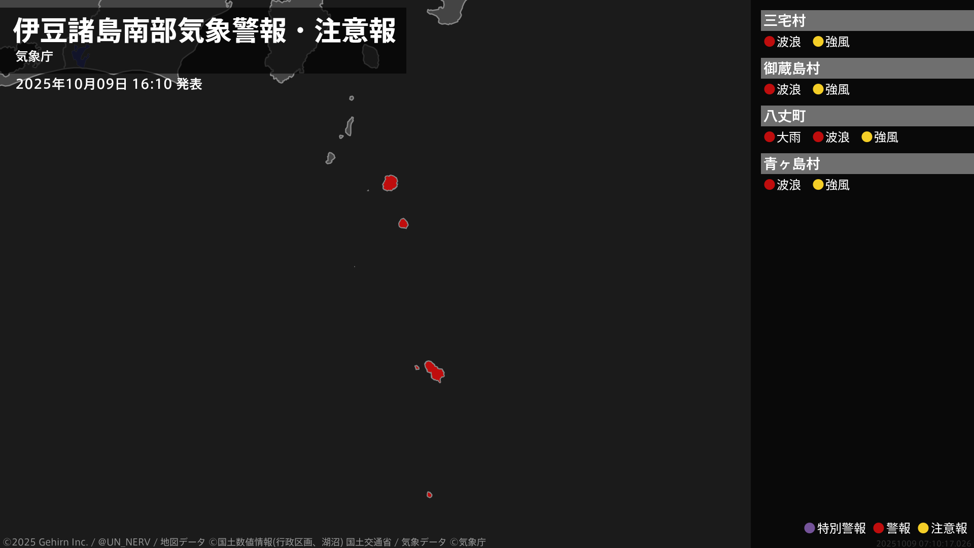【東京都 気象警報・注意報 2025年10月09日 16:10】伊豆諸島南部では、9日夜遅くまで土砂災害に警戒してください。伊豆諸島北部では9日夜のはじめ頃まで、伊豆諸島南部では9日夜遅くまで、高波に警戒してください。#気象警報注意報 #東京都