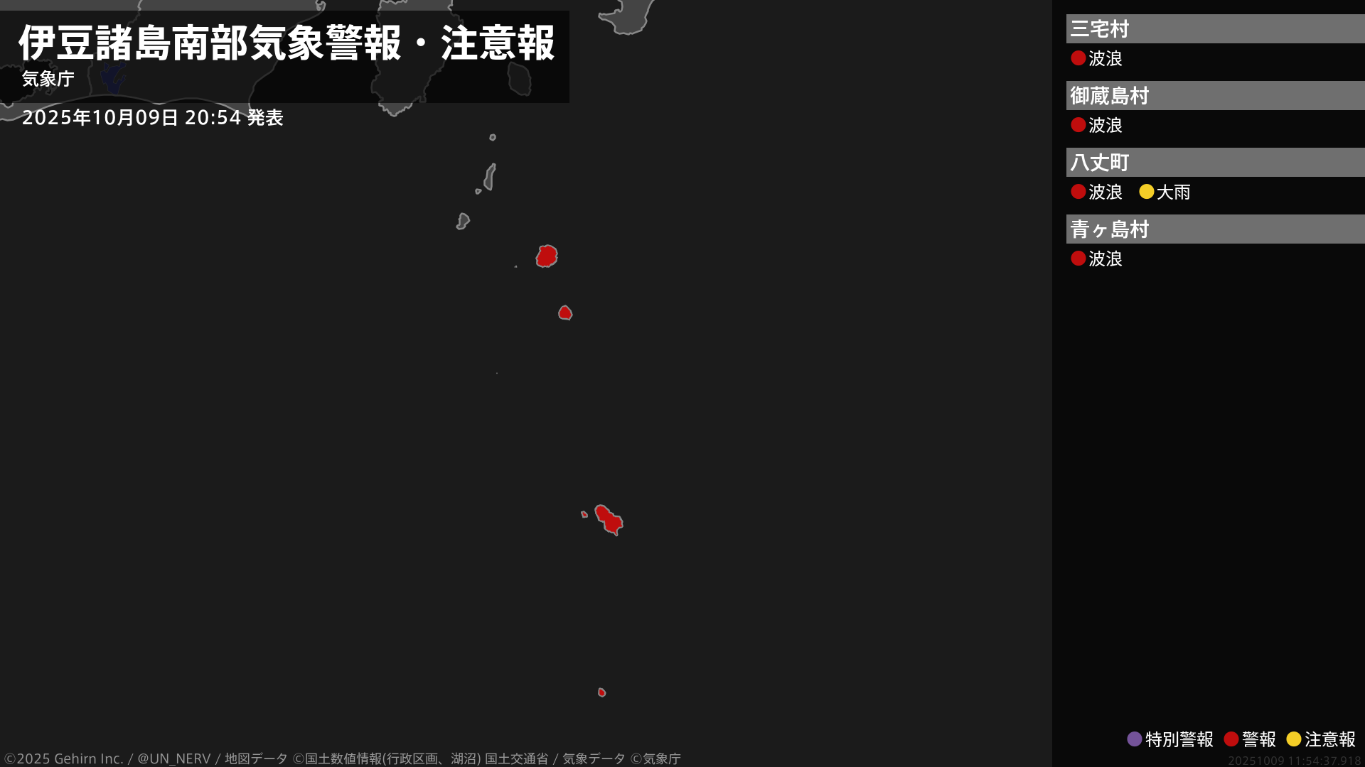 【東京都 気象警報・注意報 2025年10月09日 20:54】伊豆諸島南部では、9日夜遅くまで高波に警戒してください。#気象警報注意報 #東京都
