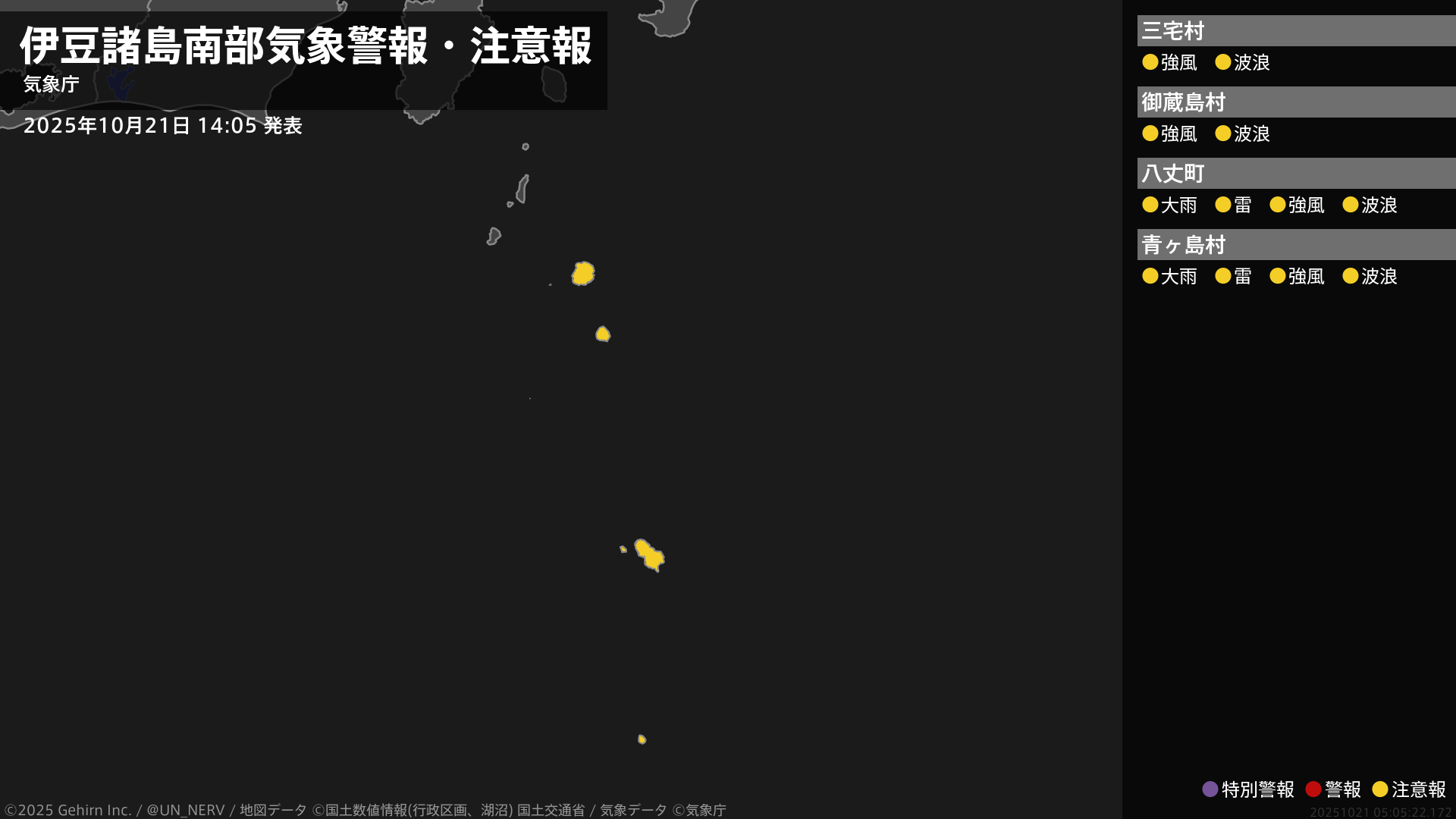 伊豆諸島では22日明け方にかけて、線状降水帯が発生して大雨災害発生の危険度が急激に高まる可能性があります。土砂災害、低い土地の浸水、河川の増水や氾濫に厳重に警戒してください。また、南西諸島と伊豆諸島では落雷や竜巻などの激しい突風に注意してください。