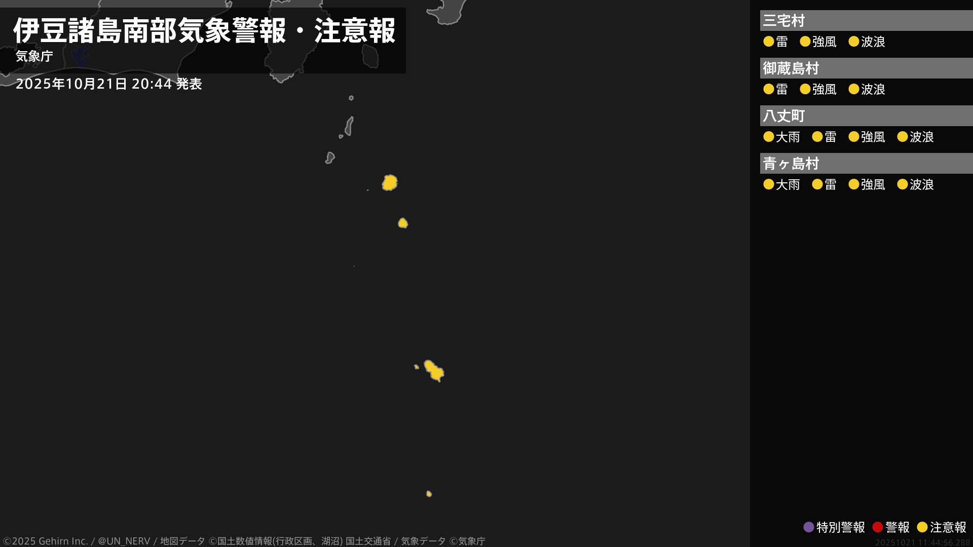伊豆諸島では21日夕方から夜遅くにかけて、線状降水帯が発生して大雨災害発生の危険度が急激に高まる可能性があります。土砂災害、低い土地の浸水、河川の増水や氾濫に厳重に警戒してください。また、落雷や竜巻などの激しい突風に注意してください。