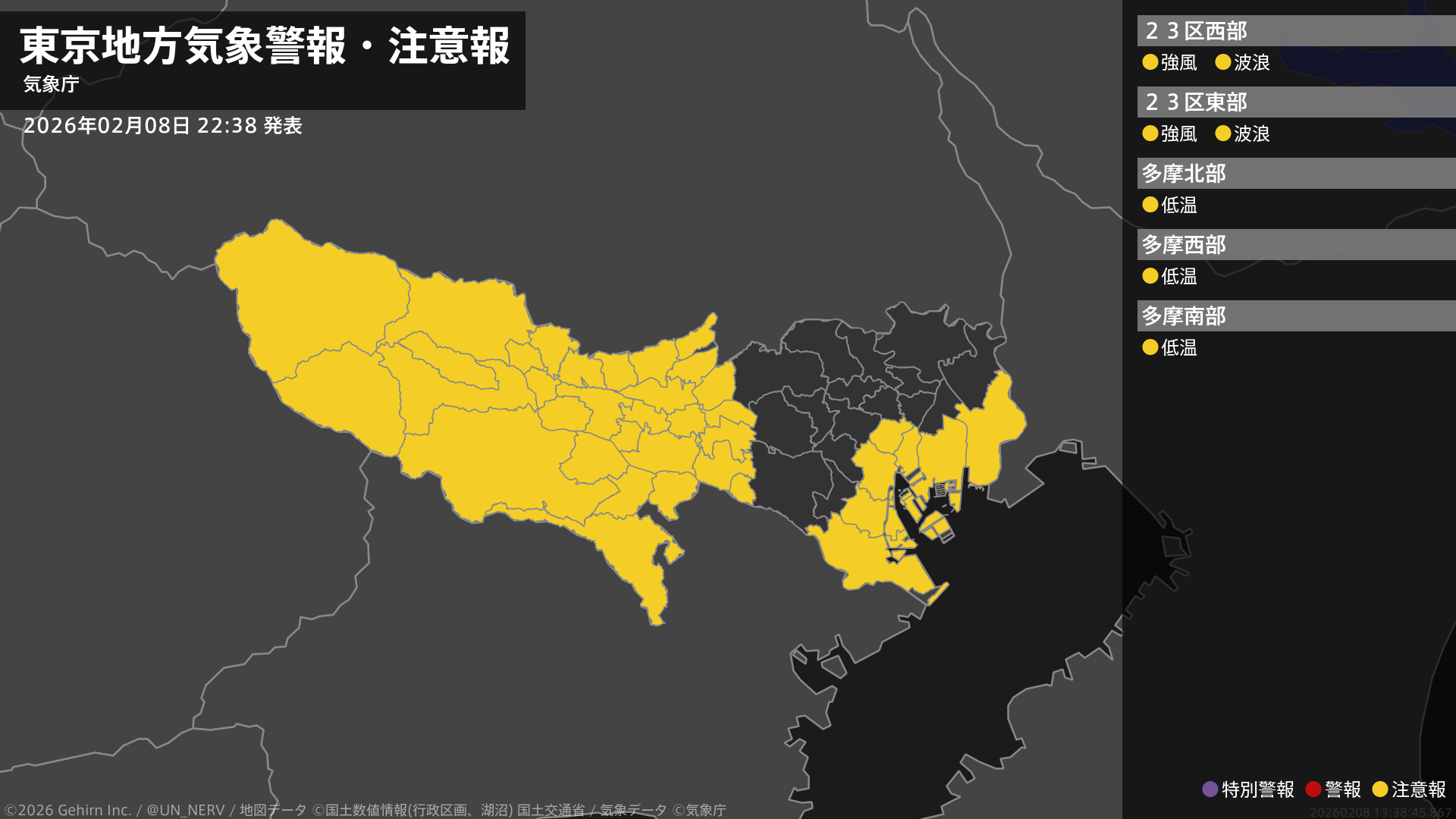 【東京都 気象警報・注意報 2026年02月08日 22:38】伊豆諸島南部では9日昼前まで、小笠原諸島では9日明け方から9日夕方まで、高波に警戒してください。#気象警報注意報 #東京都