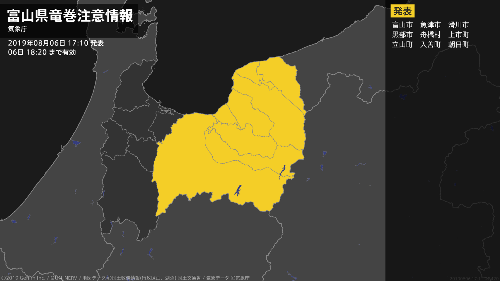 【富山県 気象警報 2019年08月06日 14:18】