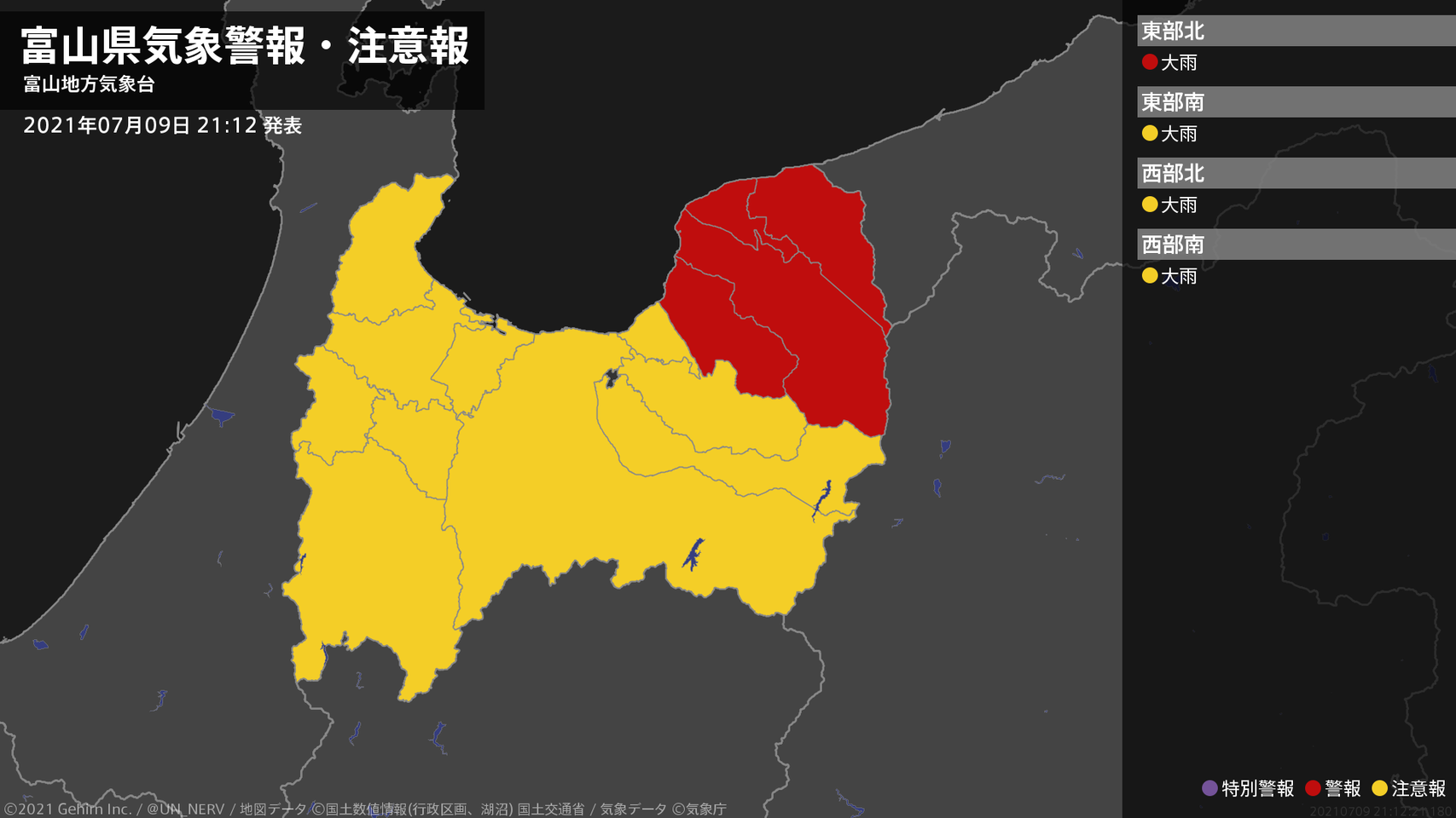 【富山県 気象警報・注意報 2021年07月09日 21:12】