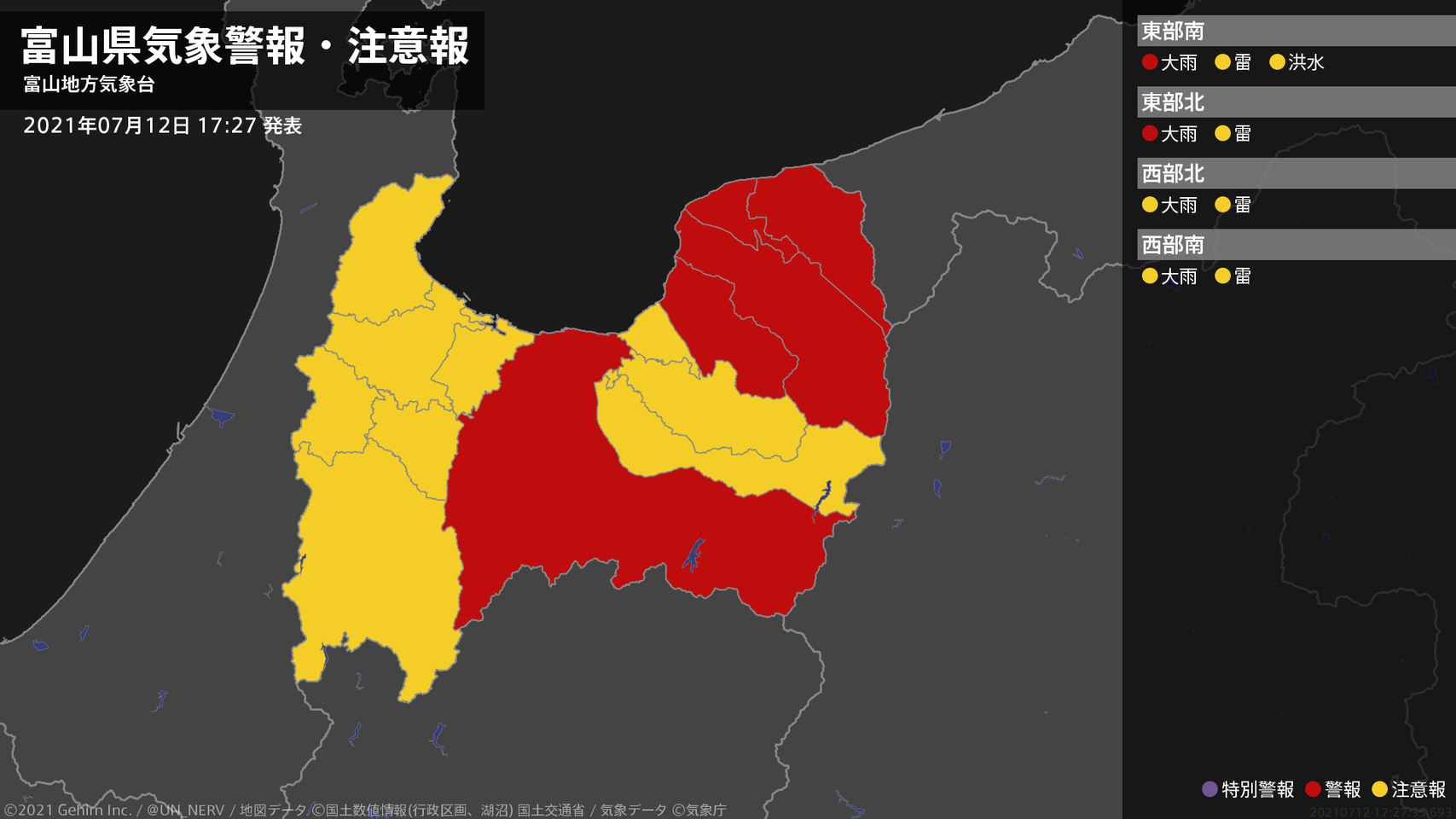 【富山県 気象警報・注意報 2021年07月12日 17:27】