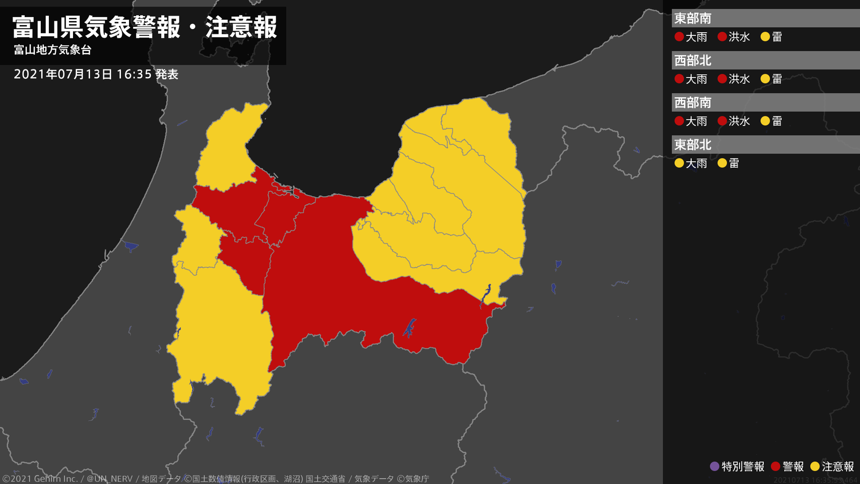 【富山県 気象警報 2021年07月13日 16:35】