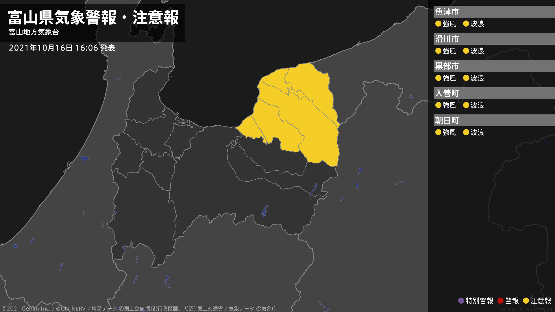 【富山県 気象警報・注意報 2021年10月16日 16:06】