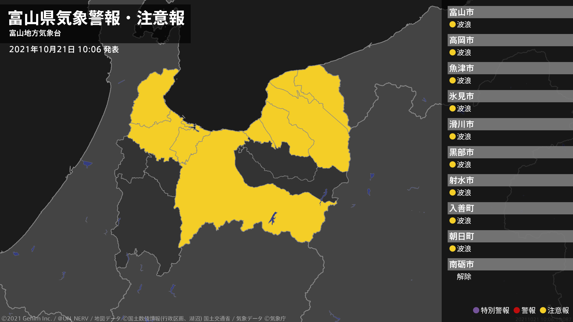 【富山県 気象警報・注意報 2021年10月21日 10:06】